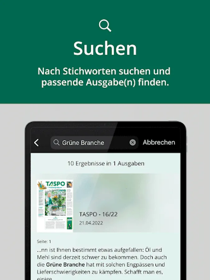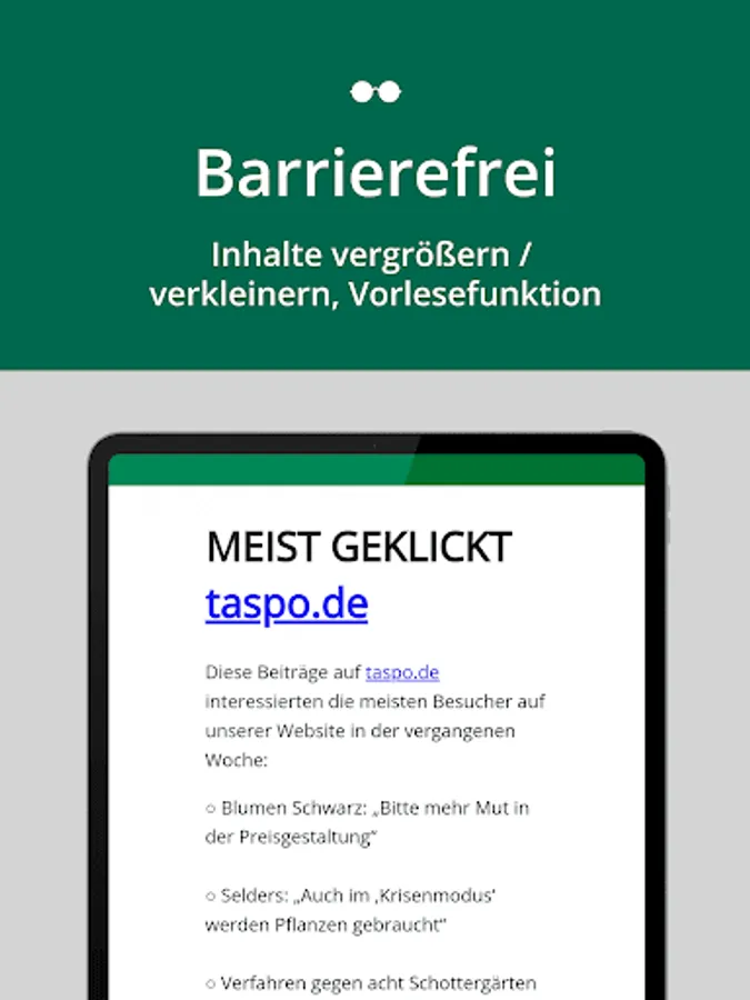 In the TASPO app you benefit from the expertise of the TASPO Group in all aspects of the green sector. These include the weekly newspaper TASPO and the two specialist magazines TASPO GARTEN-DESIGN and TASPO BAUMZEITUNG.