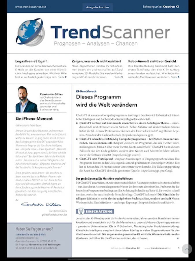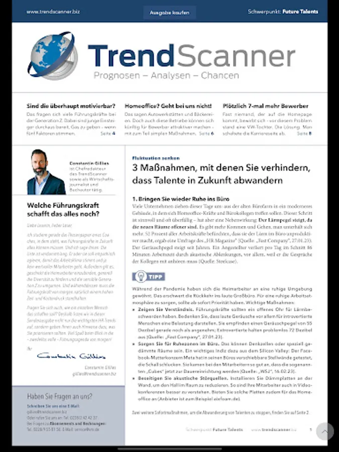 Our editorial team headed by business journalist Constantin Gillies has set itself the task of making you successful! For this purpose, the entire media landscape is combed through every day, conferences are attended and experts are interviewed - there is no trend that we have not recognized and prepared for you!