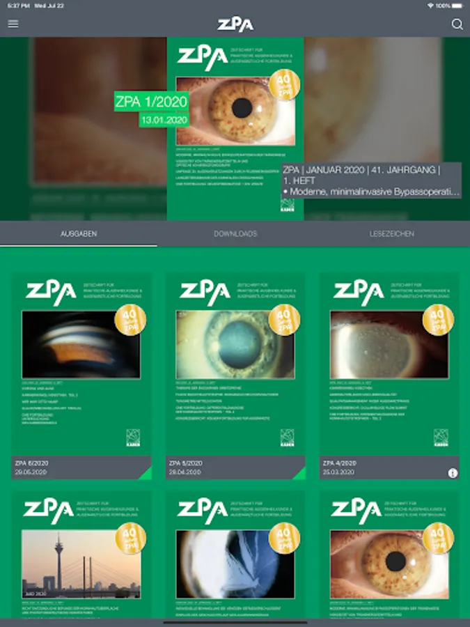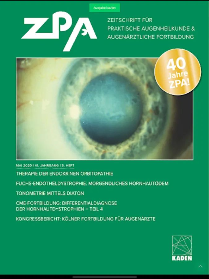 The digital ZPA. For most ophthalmologists - whether resident or working in the clinic, the ZPA - Journal for Practical Ophthalmology & Ophthalmological Training is the training magazine of choice. Comprehensive reviews on current topics with reliable knowledge of diagnostics and therapy are a central part of the ZPA. In addition, each issue offers CME training (3 CME points per issue). The successful concept of this specialist journal also includes detailed reports from important congresses, current news from the entire field of ophthalmology as well as journal articles from international literature. The ZPA is published 11 times a year.