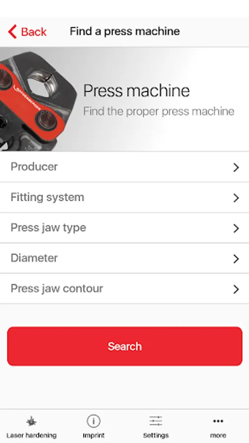 The selection coming from the system defines the search for a pressing tool. In the first step the name of the used manufacturer of the system is being selected, afterwards the precise fitting system. In the next step, parameters like the kind of press jaw, the desired diameter and the system contour can be chosen when required.