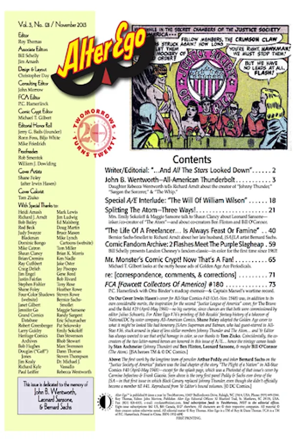 ALTER EGO, the first ‘zine devoted to comic book super-heroes, is back, all-new, and focusing on Golden and Silver Age (1940-1970) comic books and creators! Edited by former Marvel Comics editor-in-chief and writer Roy Thomas, Alter Ego draws on Roy’s roots in 1960s comics fandom, and contains new interviews with legends, vintage articles, and plenty of rare and unseen artwork, plus P.C. Hamerlinck’s FCA (Fawcett Collectors of America, featuring the archives of C.C. Beck and recollections by Fawcett artist Marcus Swayze), Michael T. Gilbert exploring Mr. Monster's Comic Crypt, Bill Schelly on classic comics fandom, and more!