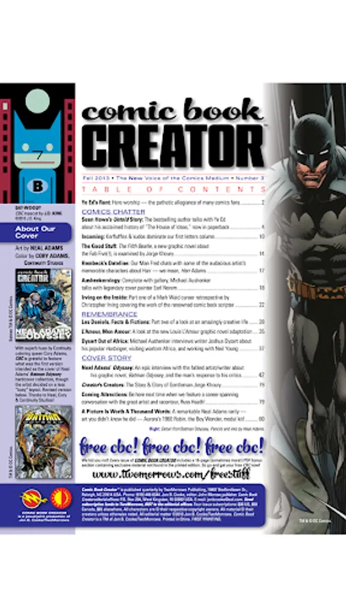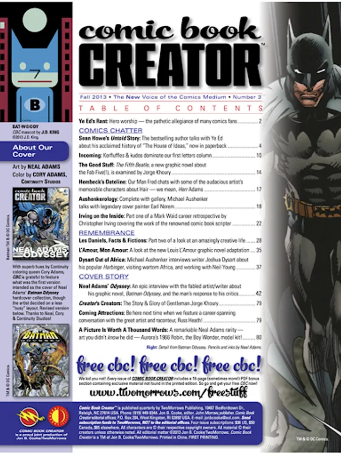Comic Book Creator magazine is the new voice of the comics medium, devoted to the work and careers of the men and women who draw, write, edit, and publish comic books—focusing always on the artists and not the artifacts. Each issue spotlights top creators through feature interviews, heavily illustrated with rare and unseen art, as they discuss everything from their current work and legacy in comics, to creator's rights and business dealings throughout their careers. CBC is edited by Jon B. Cooke, former editor of the multi-Eisner Award winning Comic Book Artist magazine.