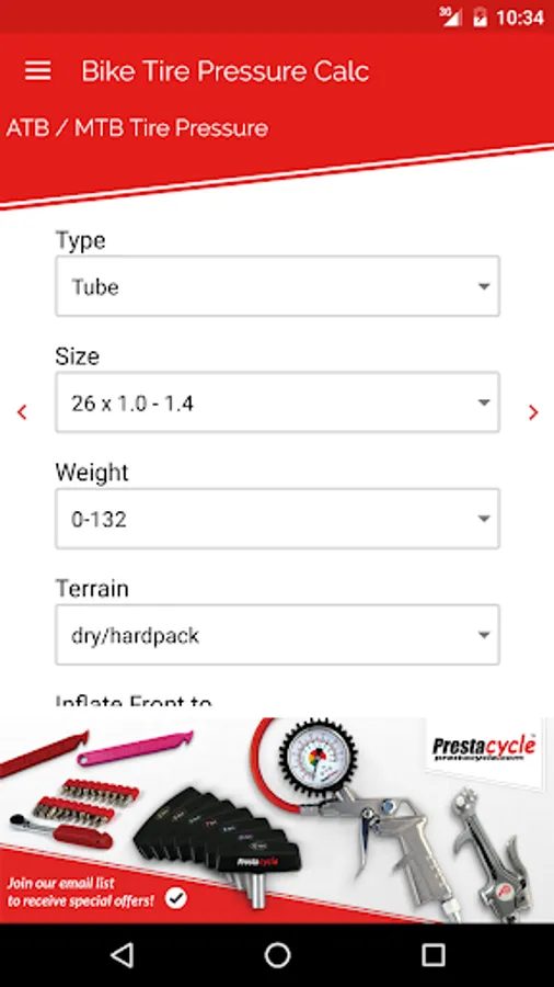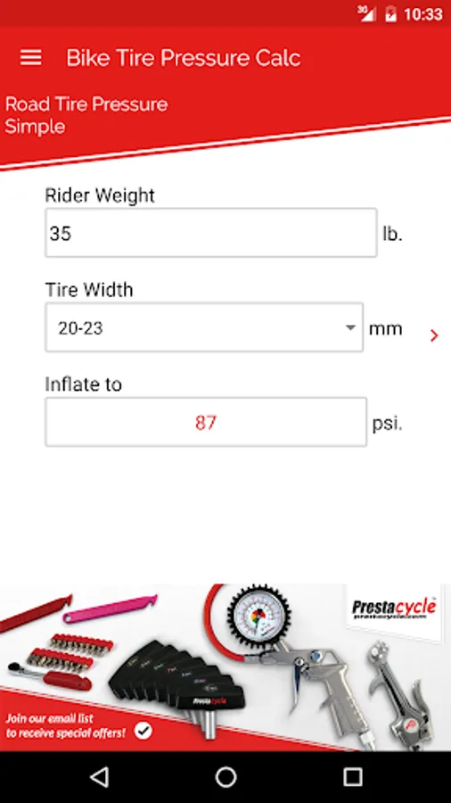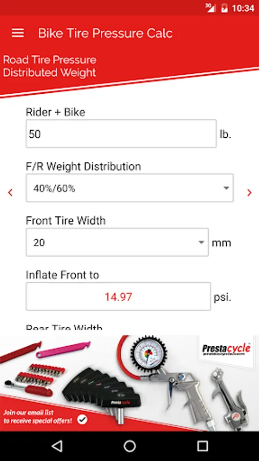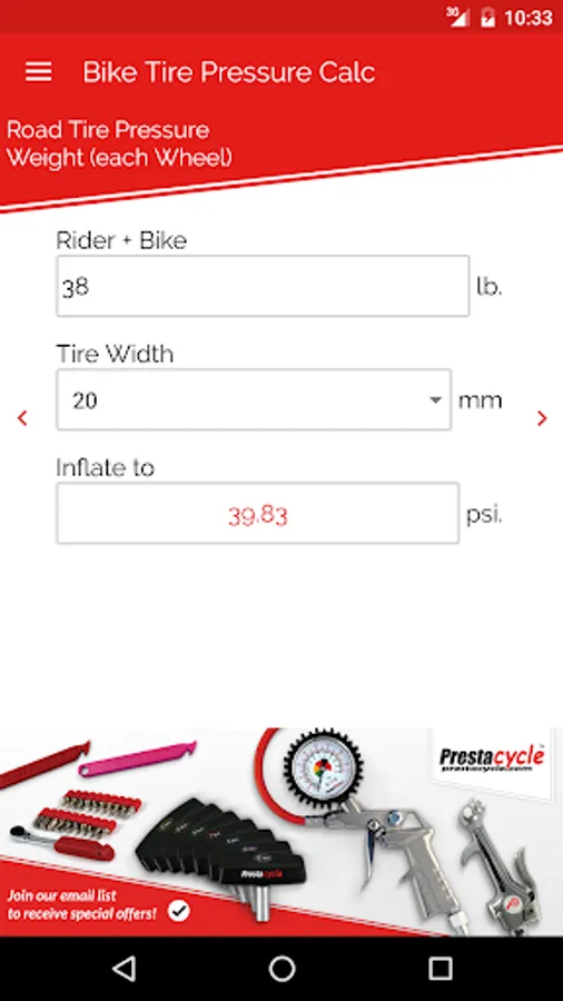 Prestacycle Bicycle Tire Pressure Calculator is a tool for bicycle riders, owners and mechanics to determine the correct tire pressure for inflation of bicycle tires. The best tire pressure varies based upon rider weight, The size and type of tires, the type of bicycle and riding conditions. This calculator provides a guide to recommendations based upon all those factors.