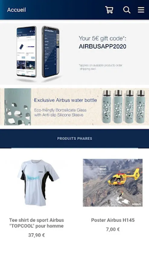The app. also provides a large range of accessories such as Books, watches, mugs, electronics items & more, all with AIRBUS logos.