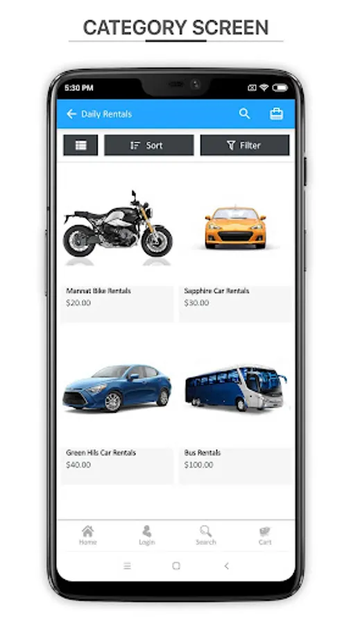 1. Flexible Home Screen Design: The store admin can design & save numerous layouts in back-end which can be used on the app as per occasions, festivals and event. It removes all the designing restrictions & lets you highlight featured products or sale deals on home screen wherever you like. A customizable Tab bar can also be added on the Rental app for easier navigation & browsing.
