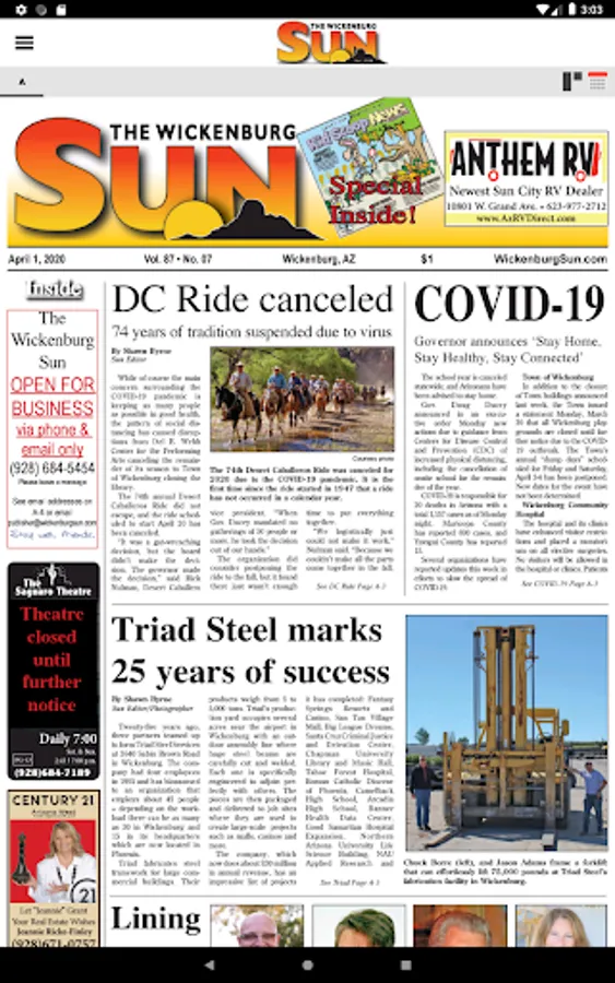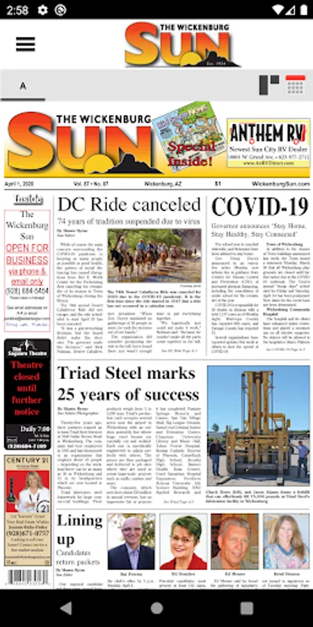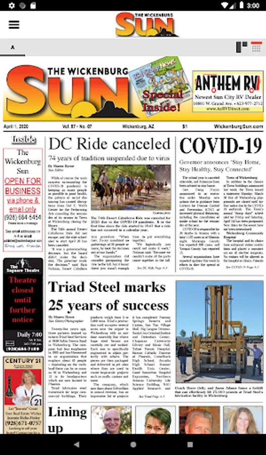 The Wickenburg Sun is a weekly, Wednesday newspaper serving Wickenburg AZ and surrounding communities. We tie up all you need to know about what's happening in and around our small Western town in a neat little package and bring it right to your mailbox, desktop or device every week. Look for News, Arts & Entertainment, Sports, Weather, Opinions, Obituaries, Club Happenings, Business Features, Ropin' & Ridin', Education Coverage, Health News, Classifieds, Real Estate, Jobs, Garage Sales, History, Public Notices, Community Calendar, Grocery Store Specials, Kids Activities, Advertising, and more.