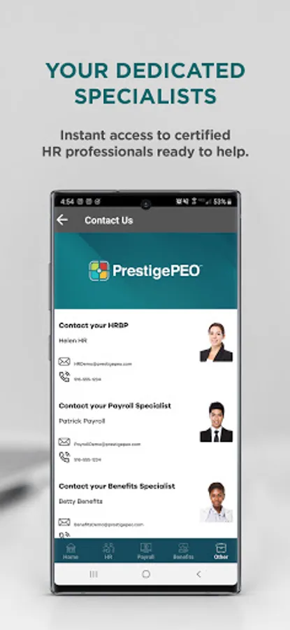PrestigeGO simplifies HR for you and your employees by putting the power of a PEO right in your pocket. Access payroll options, view employee benefits information, and instantly connect with your dedicated HR specialists – anytime and anywhere.