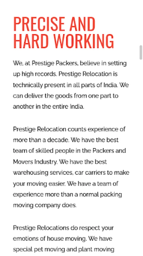 Prestige Relocation counts experience of more than a decade. We have the best team of skilled people in the Packers and Movers Industry. We have the best warehousing services, car carriers to make your moving easier. We have a team of experience more than a normal packing moving company does.