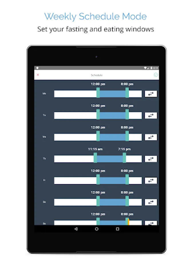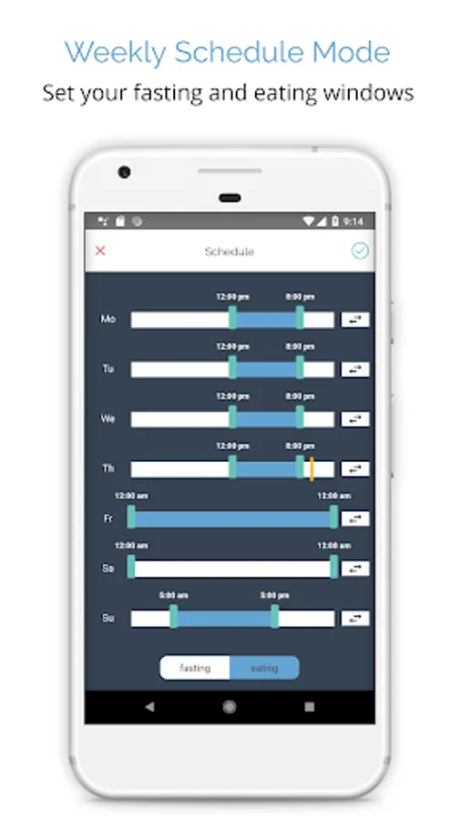 ★ Schedule out all your fast and eating windows for the week and let the app timer run automatically with notifications telling you when to stop eating and when to start fasting. For example you could easily schedule a 16 hour fast window for every day of the week.