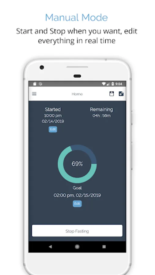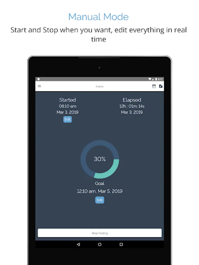 ★ Manual Mode: Choose a fasting or eating window. Start and stop when you want. Edit all times, dates, goal length in real times.