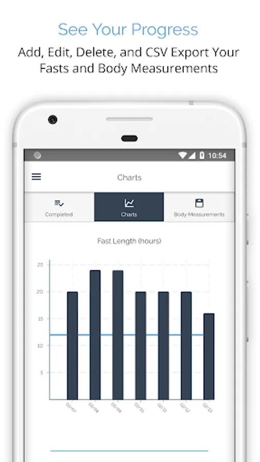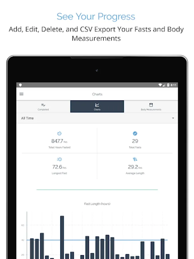 ★ Easily add, edit, delete, and .CSV export your completed fasts and body measurements like weight