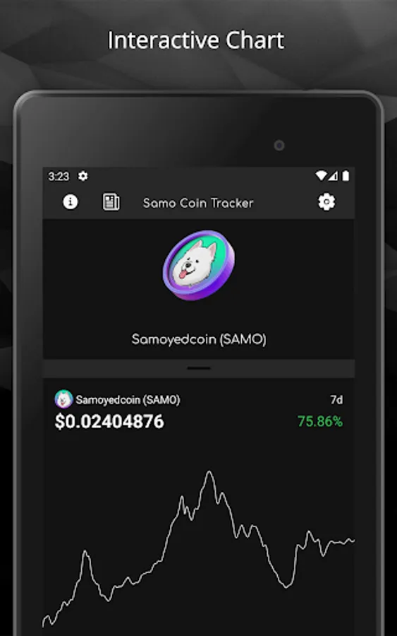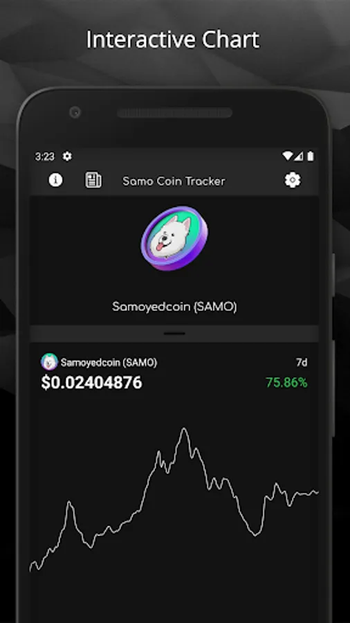The Samo Coin Tracking app lets you easily view the price, and daily, weekly, monthly and 2 month percent change of the value of the SAMO Coin.