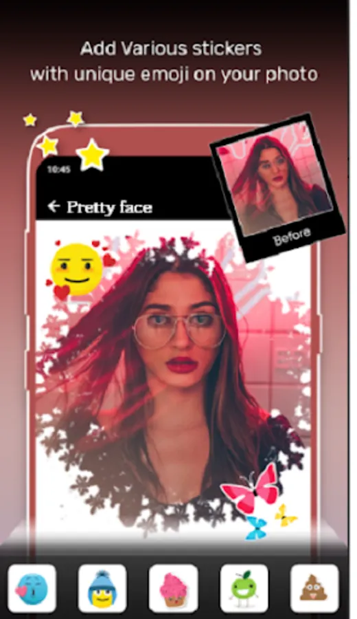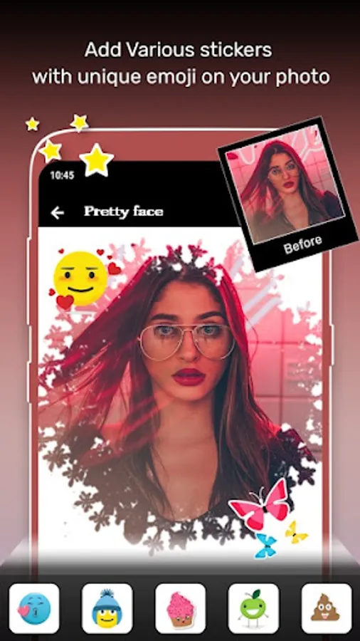 Pretty face makes editing your photo really easy and fun. Its easy UI and tools buttons, makes photo editing really easy for everyone. Give effect and photo shattering effects to your pictures with just one tap. Really easy!! Make awesome square size instagram photos and get thousands of likes with pretty face tag.