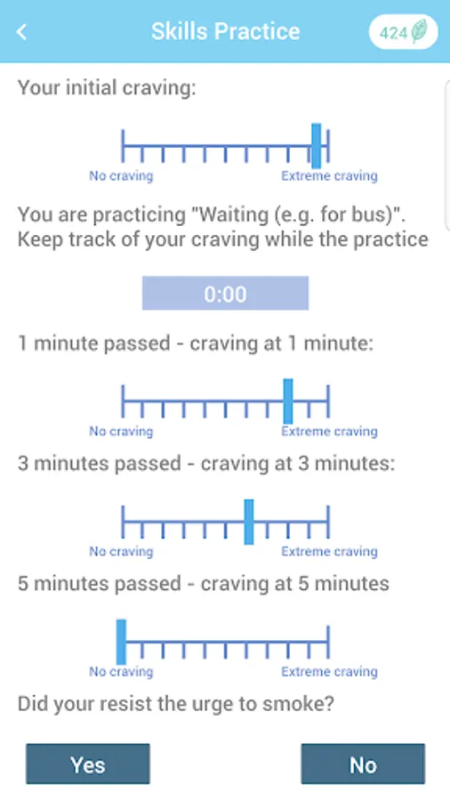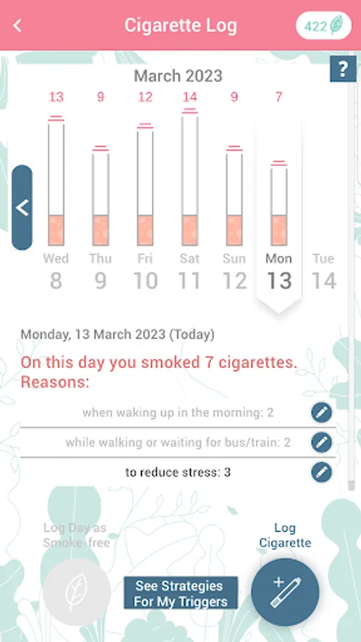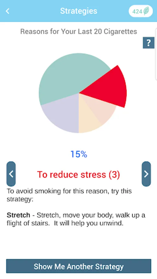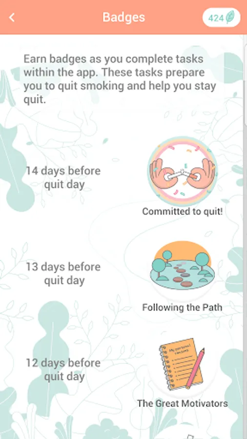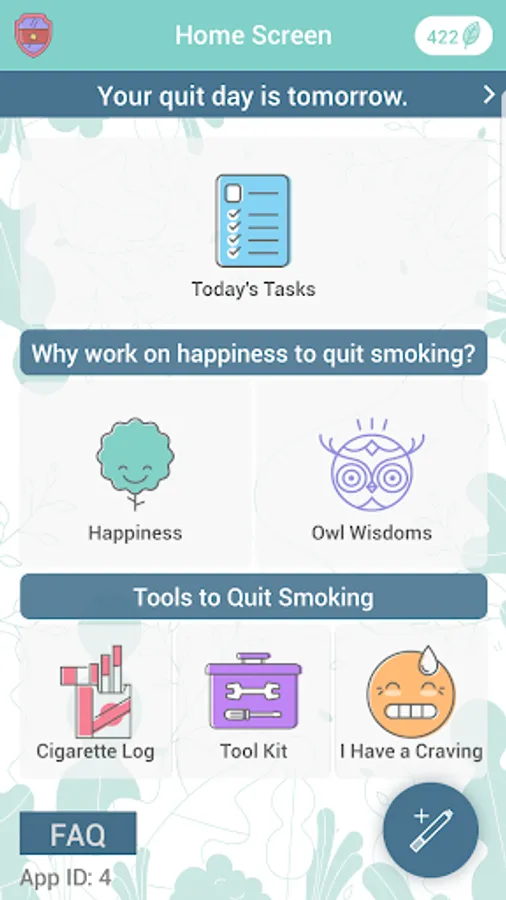 - Complete a specific task using one of the app’s tools. These tasks include, for example, specifying your personal reasons for quitting smoking, browsing strategies to overcome your smoking triggers, learning about benefits of quitting smoking, practicing to resist the urge to smoke, seeing how much money you saved by not smoking, etc.
