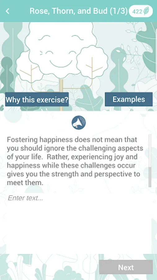 In this app, we ask you to work on your happiness. Each day, we ask you to complete a Habit-Building Exercise. Completing these exercises gets you in the habit of noticing the good things in your life, and lets you draw strength from them.