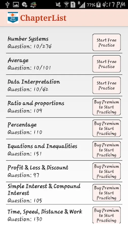 In this FREE version of PREXAM Bank Clerk Exam App you would get 3 tests free in "Take a Test" and few free questions for 3 Chapters for each subject in "Practice Qs". The premium App costs Rs.900. In Premium App you will receive unlimited "Take a Test" as well practice through complete question bank using "Practice Qs"