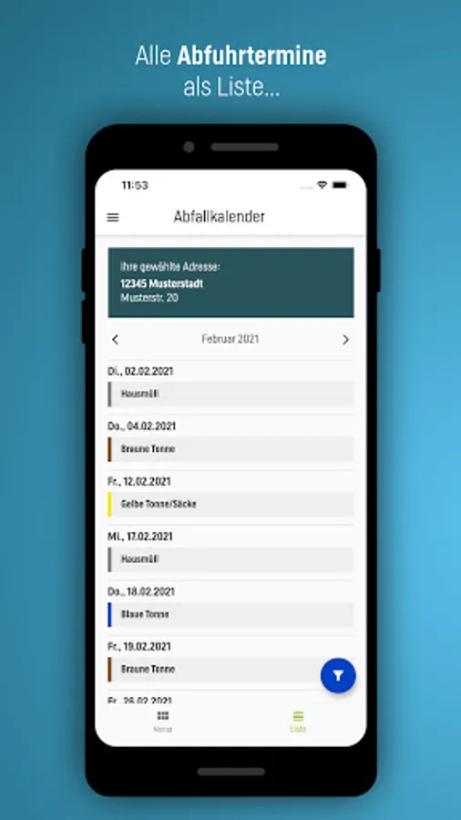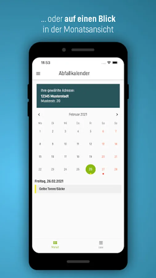 With this app you can call up the waste calendar of your municipality. After selecting your address and the desired month, you will see all collection dates in a clear view. You can also filter the types of waste as you wish.