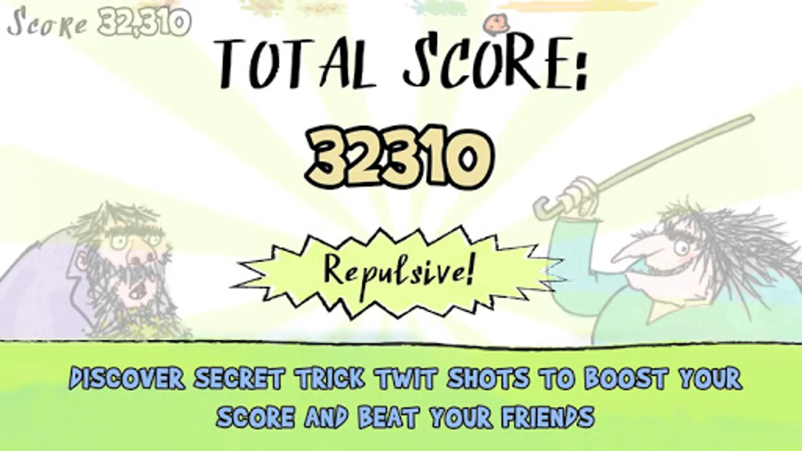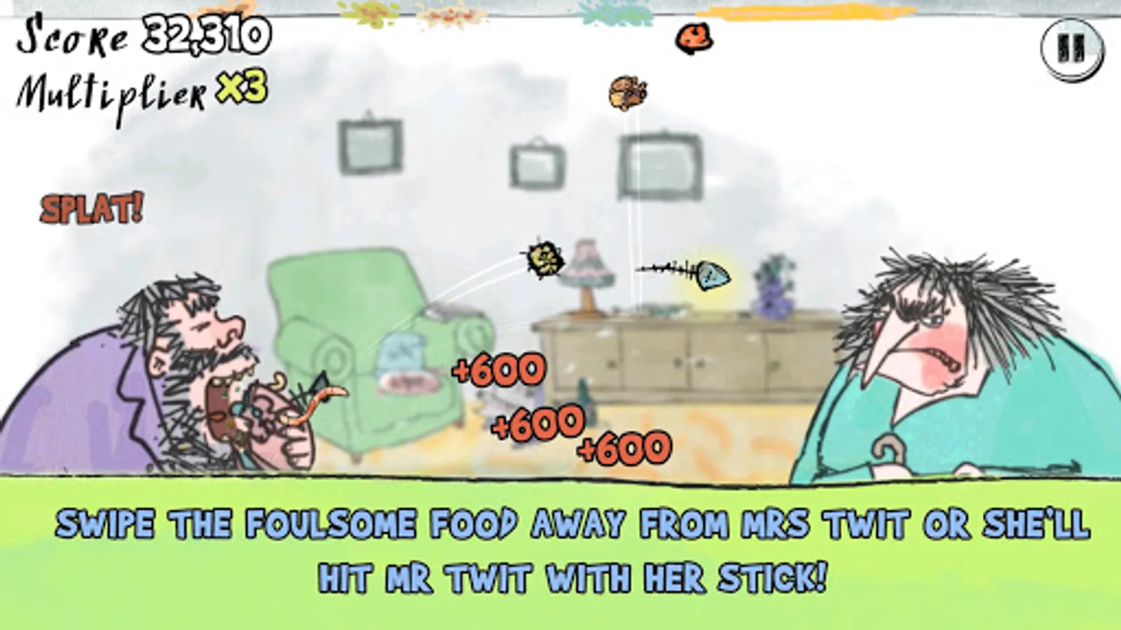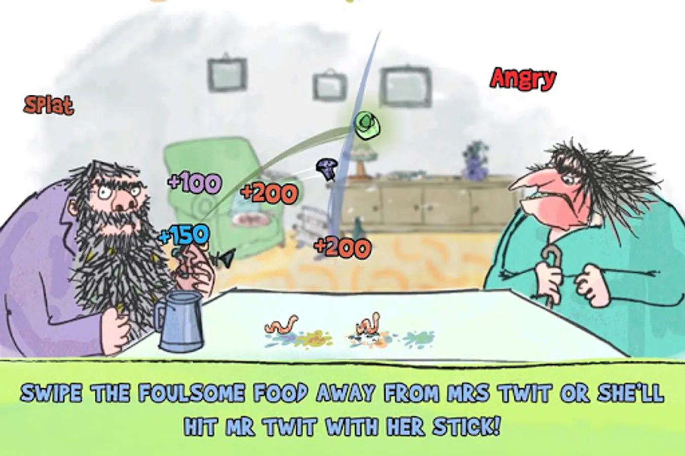 Every time Mr Twit eats, foulsome food flies towards Mrs Twit who is trying to sleep. Score by stopping the mouldy morsels hitting her. But watch out because if she wakes up she'll whack Mr Twit with her stick and then it's GAME OVER!