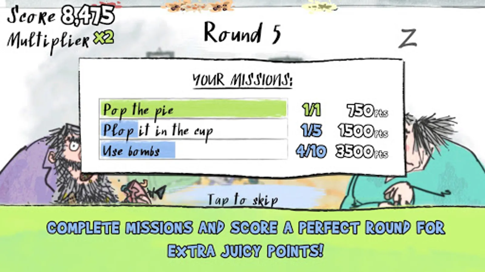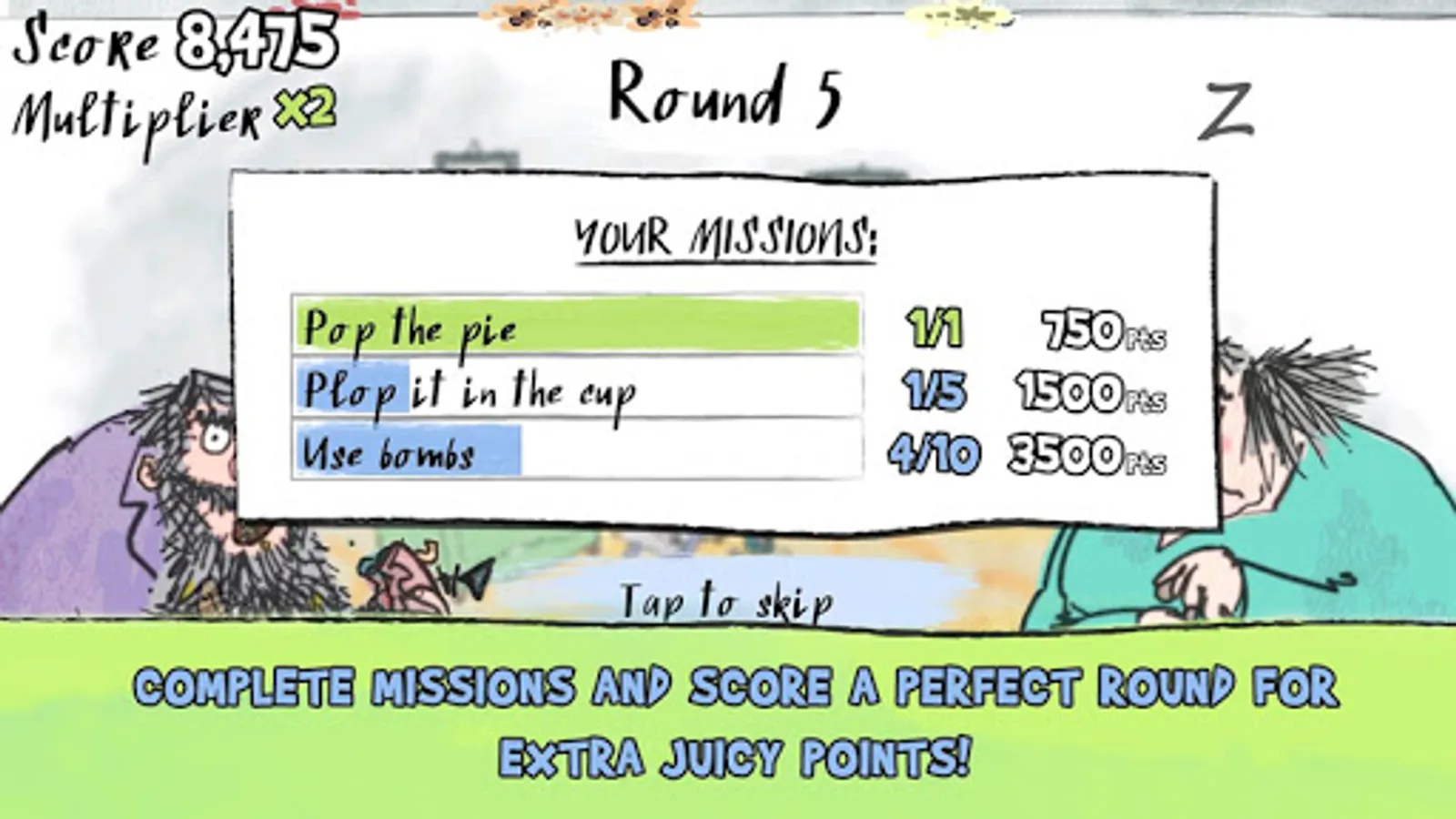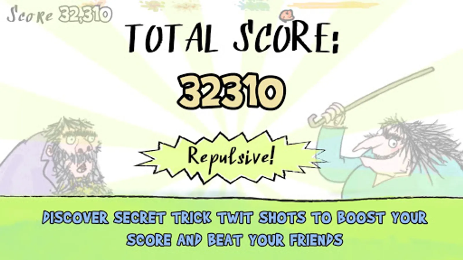 Every time Mr Twit eats, foulsome food flies towards Mrs Twit who is trying to sleep. Score by stopping the mouldy morsels hitting her. But watch out because if she wakes up she'll whack Mr Twit with her stick and then it's GAME OVER!