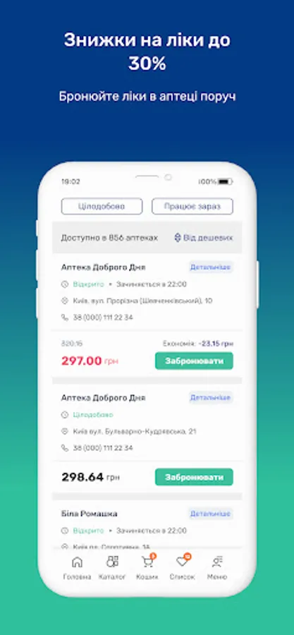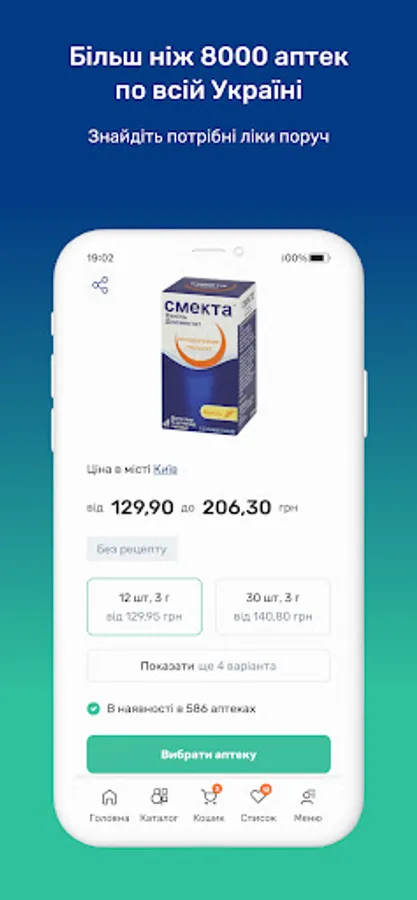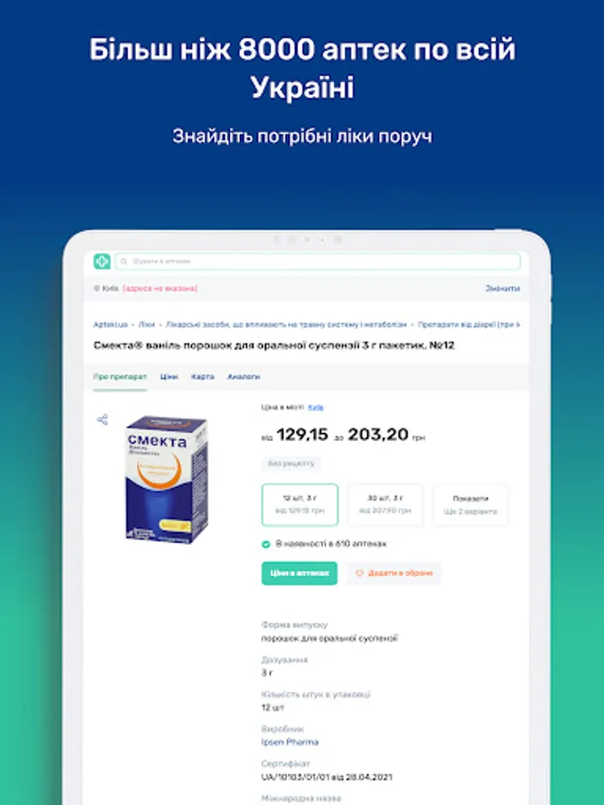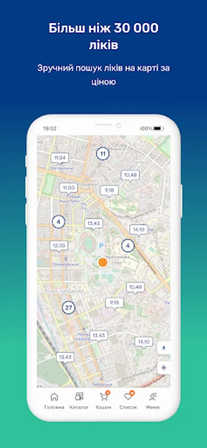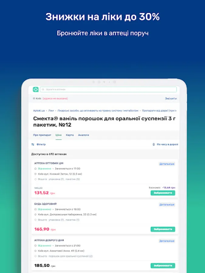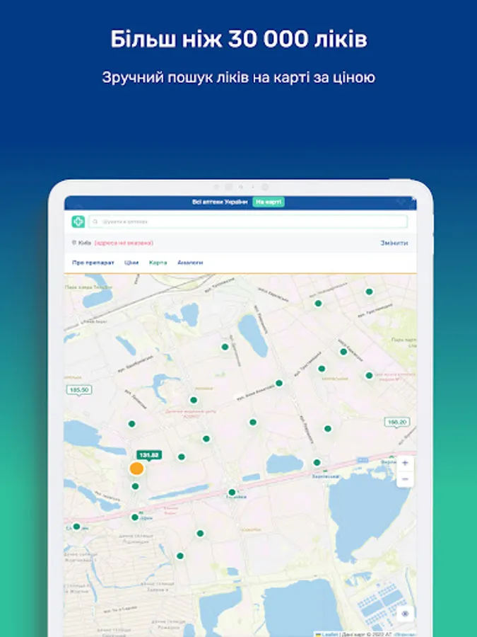 In the mobile application, pharmacies are represented in the following cities: Kyiv, Kharkiv, Odesa, Lviv, Dnipro, Poltava, Vinnytsia, Zaporizhzhia, Kryvyi Rih, Ivano-Frankivsk, Chernivtsi, Mykolaiv and others.