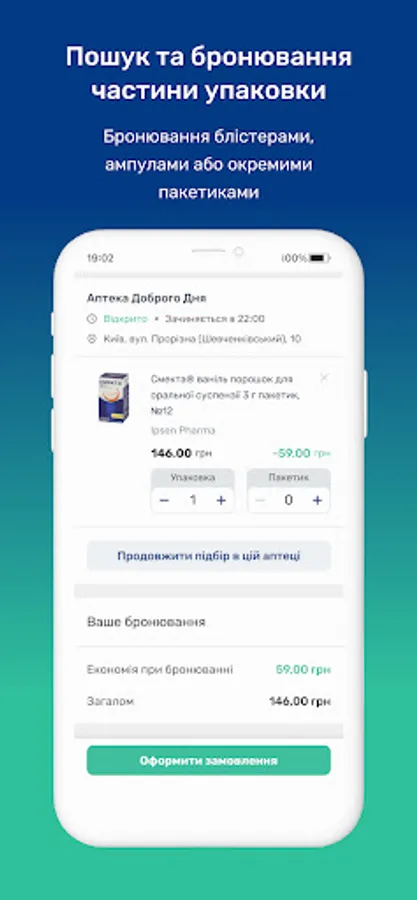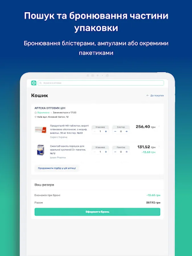 Apteki.ua official application is a convenient solution for booking a whole list of medicines in one pharmacy near you. You can book part of the package - suspensions, mixtures, solutions.