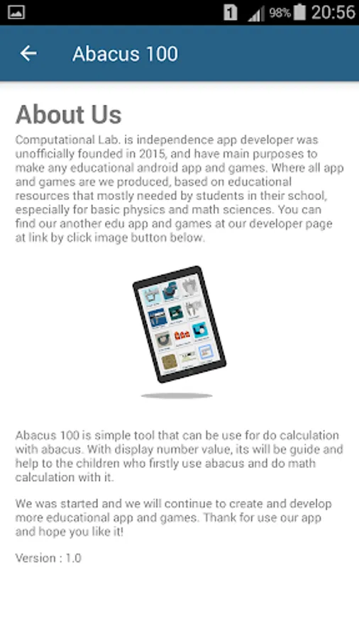 Abacus 100 is simple math tool that can be use for do calculation exercise with abacus and 100 beads. With display number value, its will be assist childrens who firstly use abacus and do basic math calculation with it. Let try and have fun