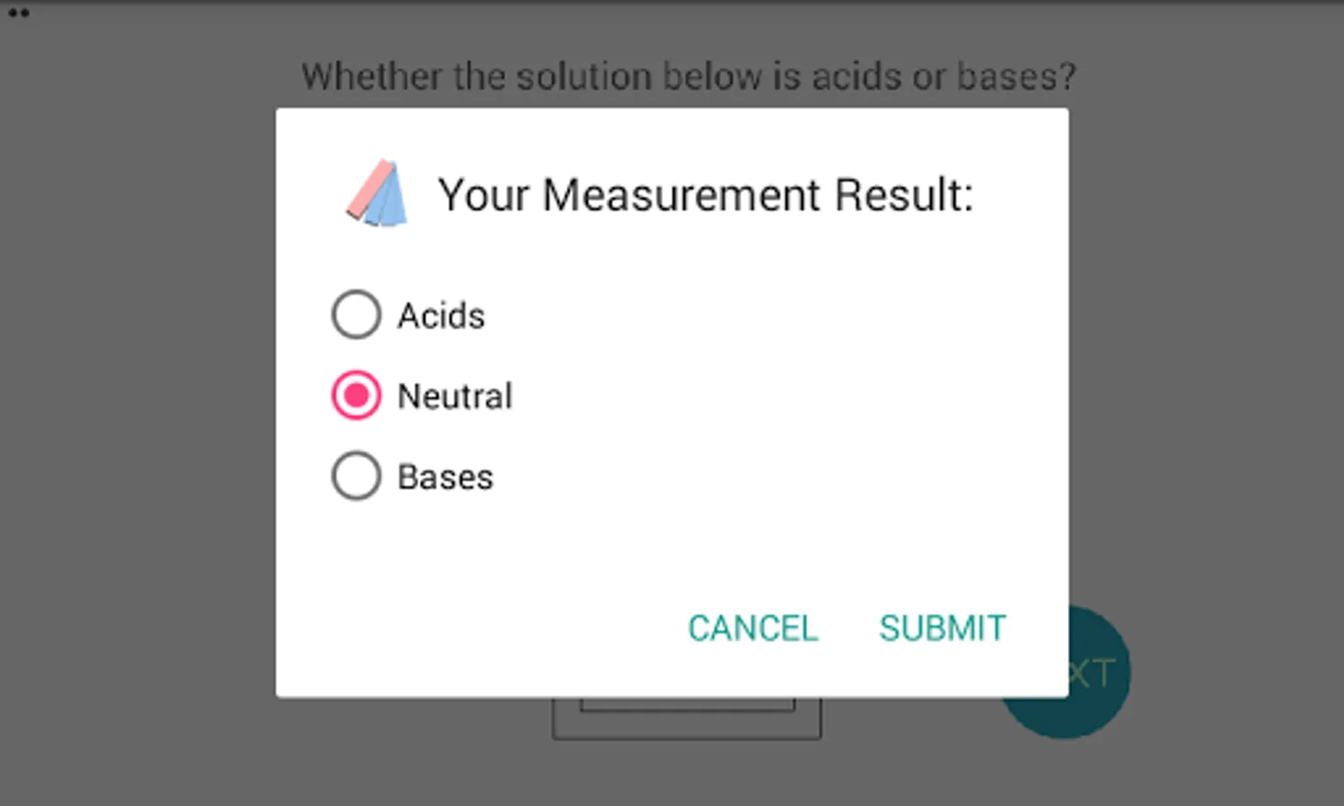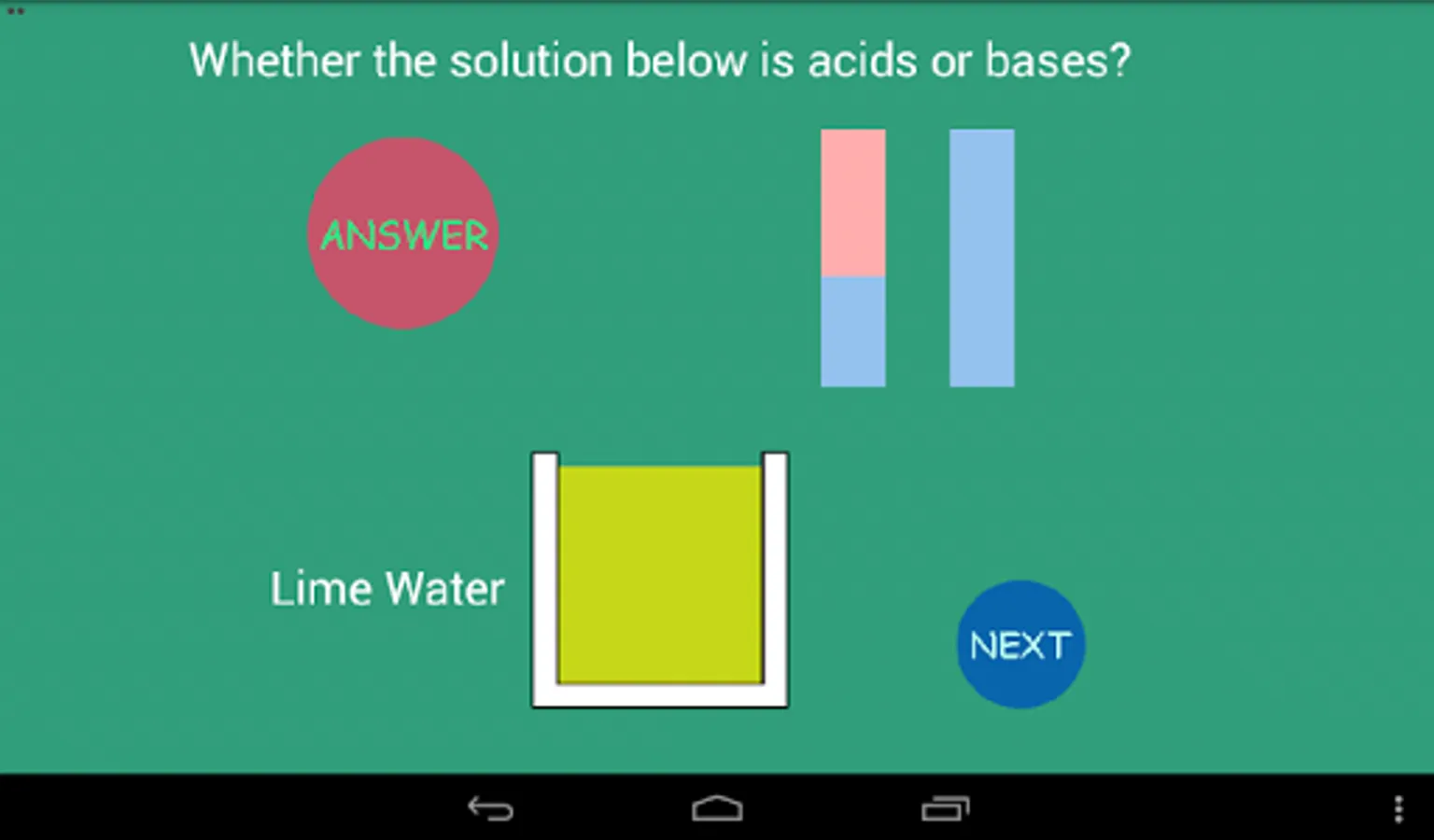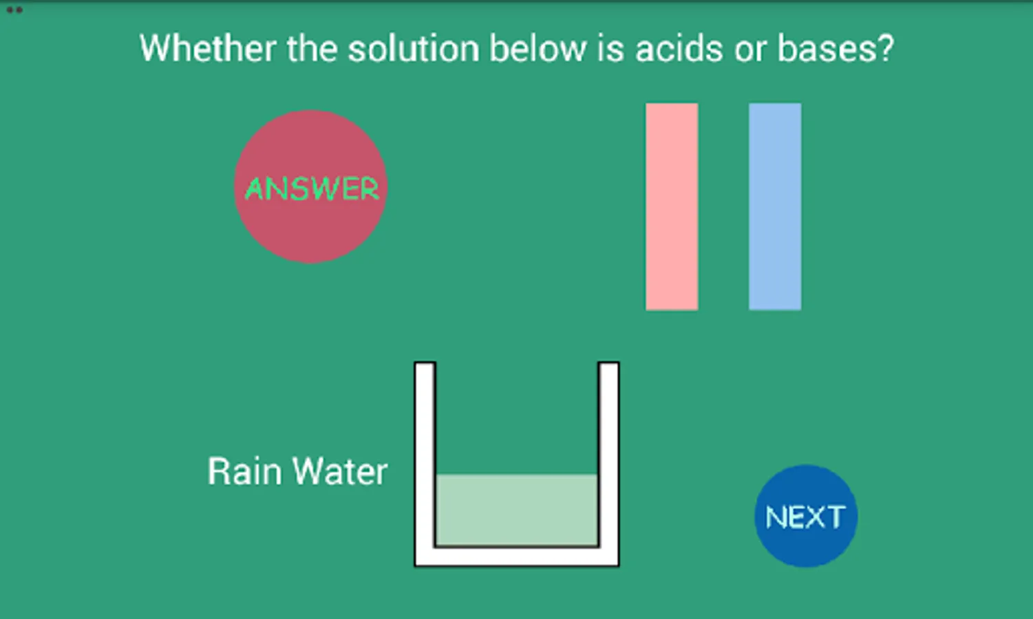 This educational app is simple simulation how to determine acid or base of the solution, based on changing the litmus color. Basically, if the solution is acidic, the solution can redden blue litmus. And if the solution is base, the solution can be blueing red litmus. Based on the condition, then if the litmus paper dipped into the solution, we will be able to identify whether a solution is acidic or base. For new version we has changing the background to green color, since to most viewing the solution color. Please try it and have fun!