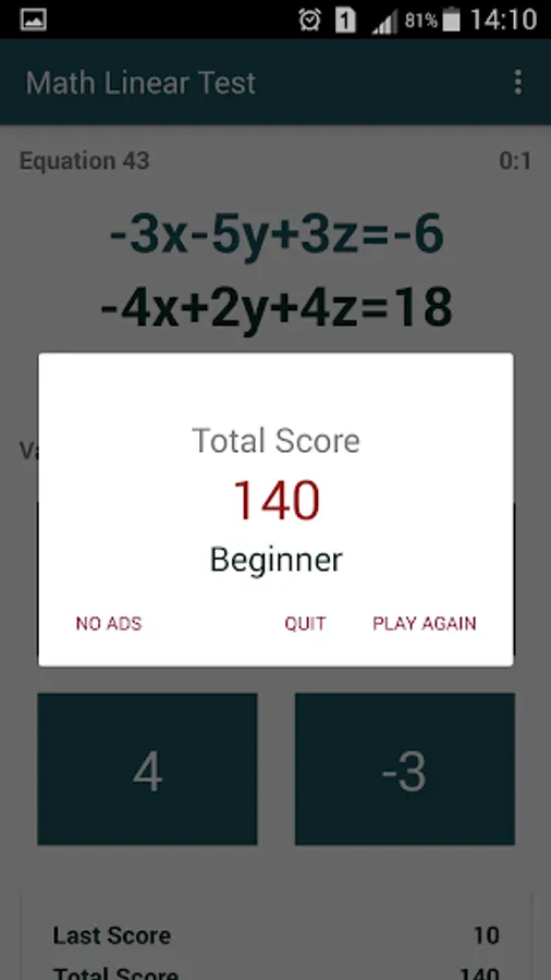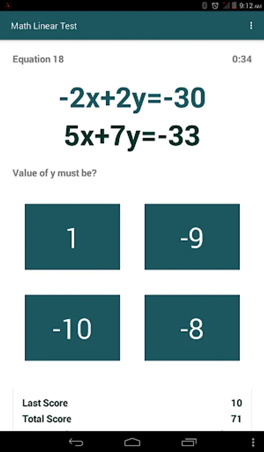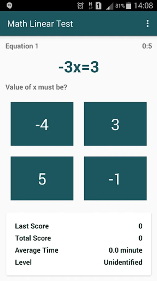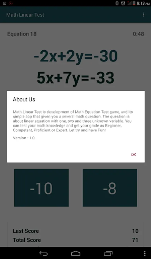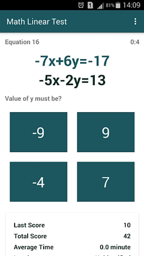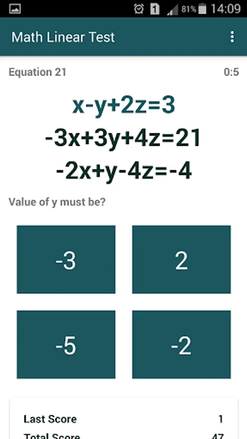 Math Linear Test is simple math game that provided to you several linear math equation. The game play is simple, you just choose what the value must be x,y or z that suitable with the equation. And the score that you can get is represent to you how far your knowledge about math linear equation with one, two or three unknown variable. Let try our math game. And have fun!