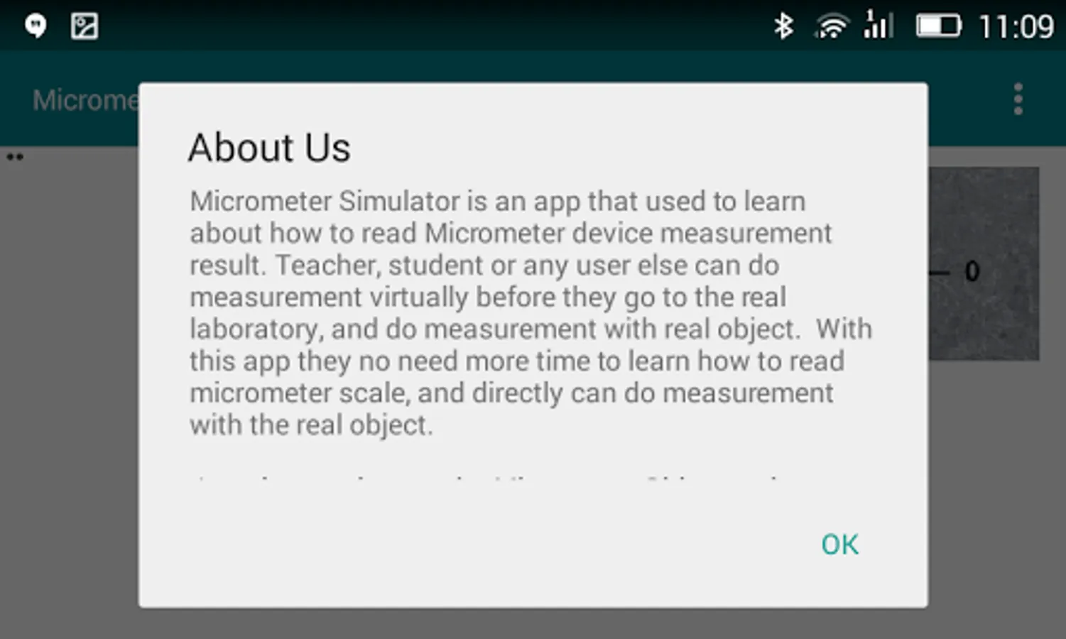 Micrometer Simulator is an app that used to learn about how to read Micrometer device measurement result. Teacher, student or any user else can do measurement virtually before they go to the real laboratory, and do measurement with real object. With this app they no need more time to learn how to read micrometer scale, and directly can do measurement with the real object.