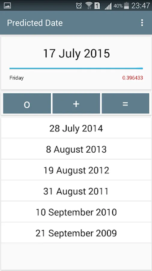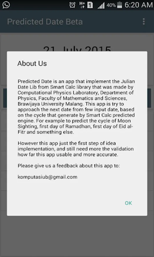 As in the first screenshot, Predicted Date can predict the first day on Eid al-Fitr in year 2015 in Indonesia. It's just can be predict at 17 July 2015 as first day of Syawwal, if we use the 28 July as first day Syawwal on 2014.