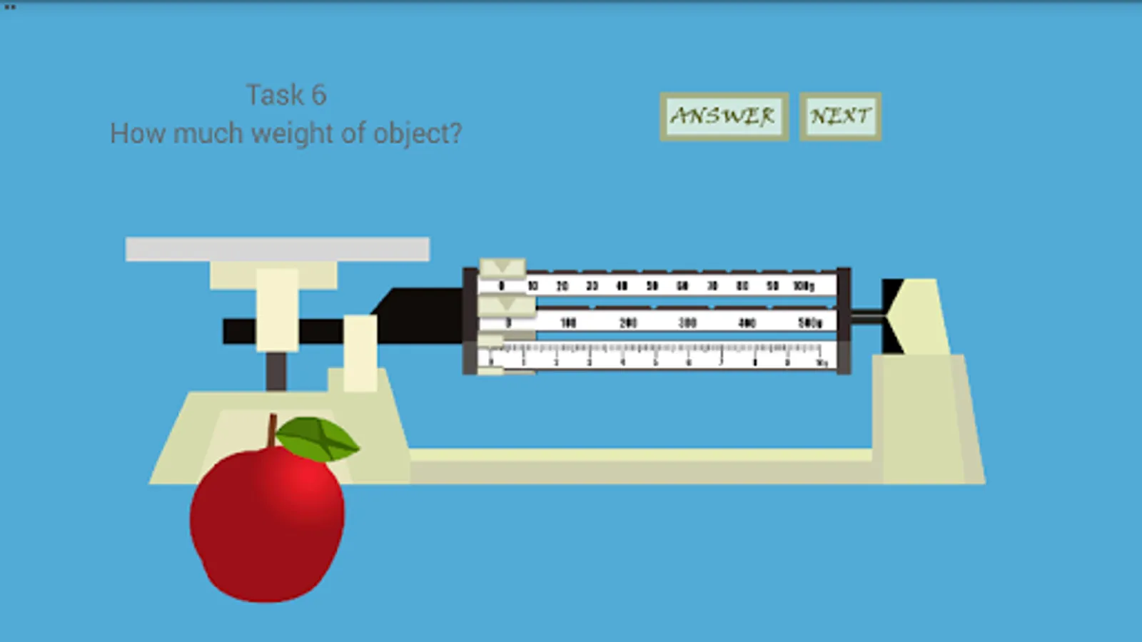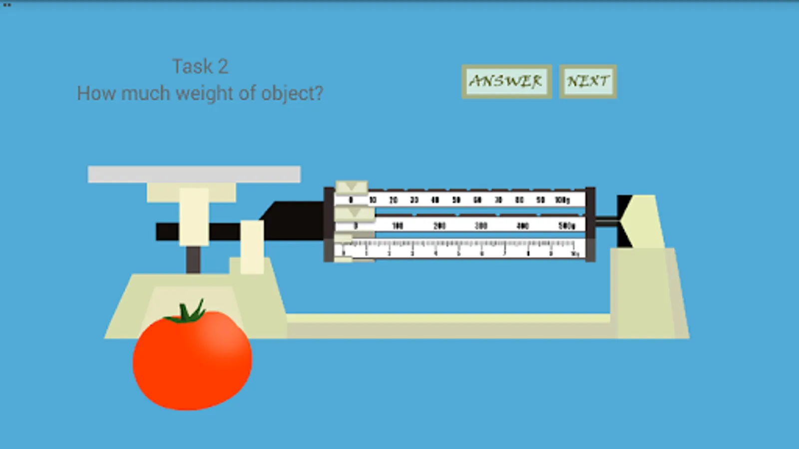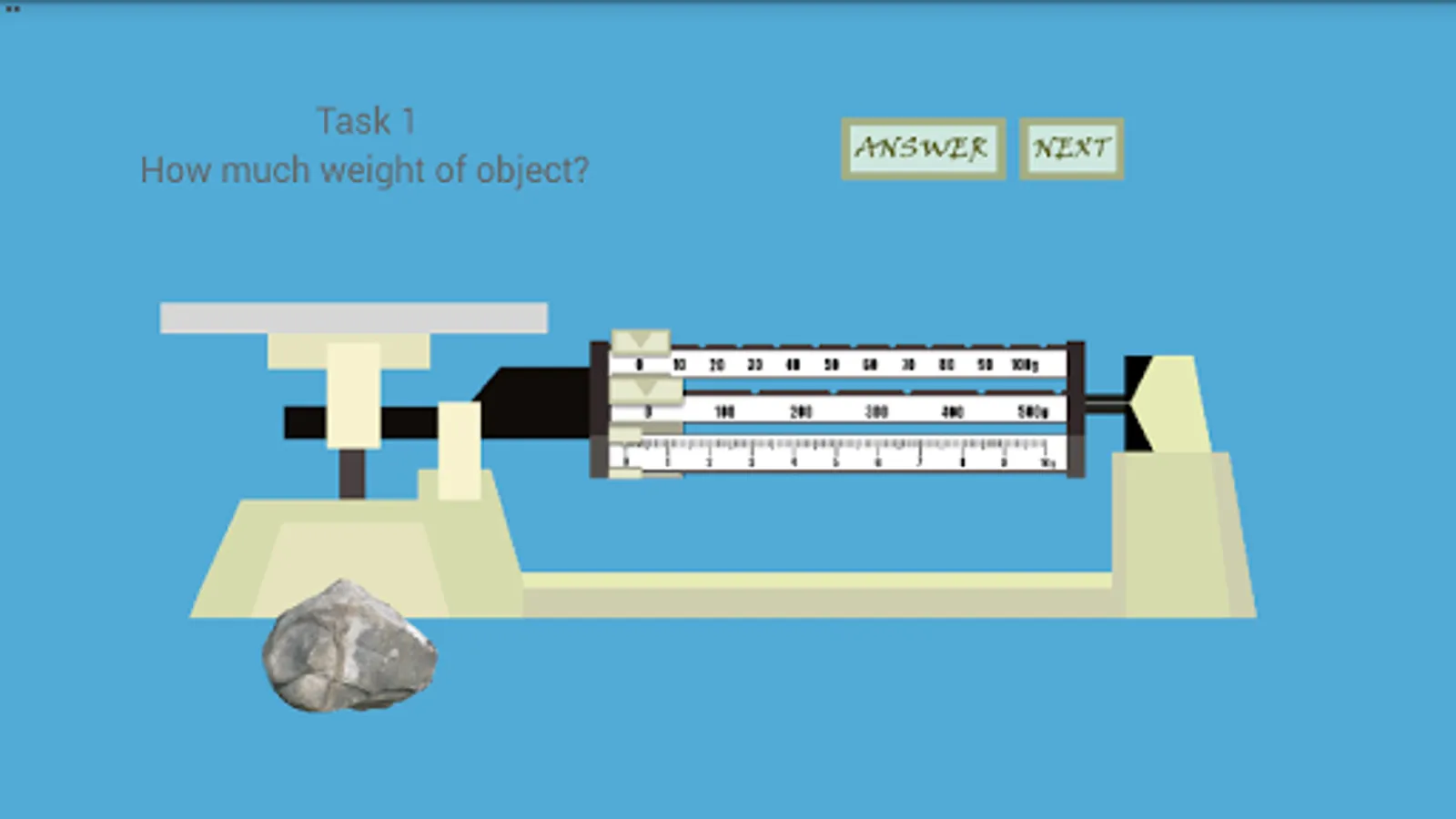 Triple Beam Balance is an simple game that simulate how to measure an object with Triple Beam Balance device. This game have 20 task that must finished by player to learn how to do measurement. In every task player will be given by one random object with random weight. With this app, players are expected to master the basics of using a triple beam balance. Try it and have fun!