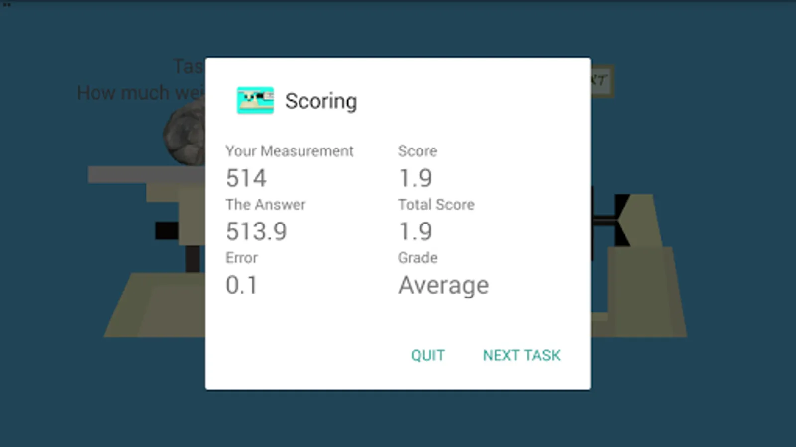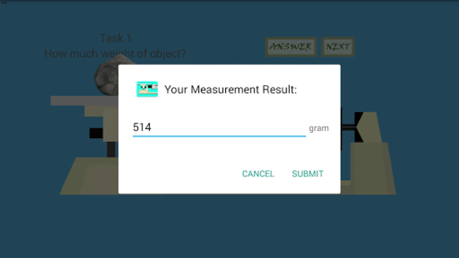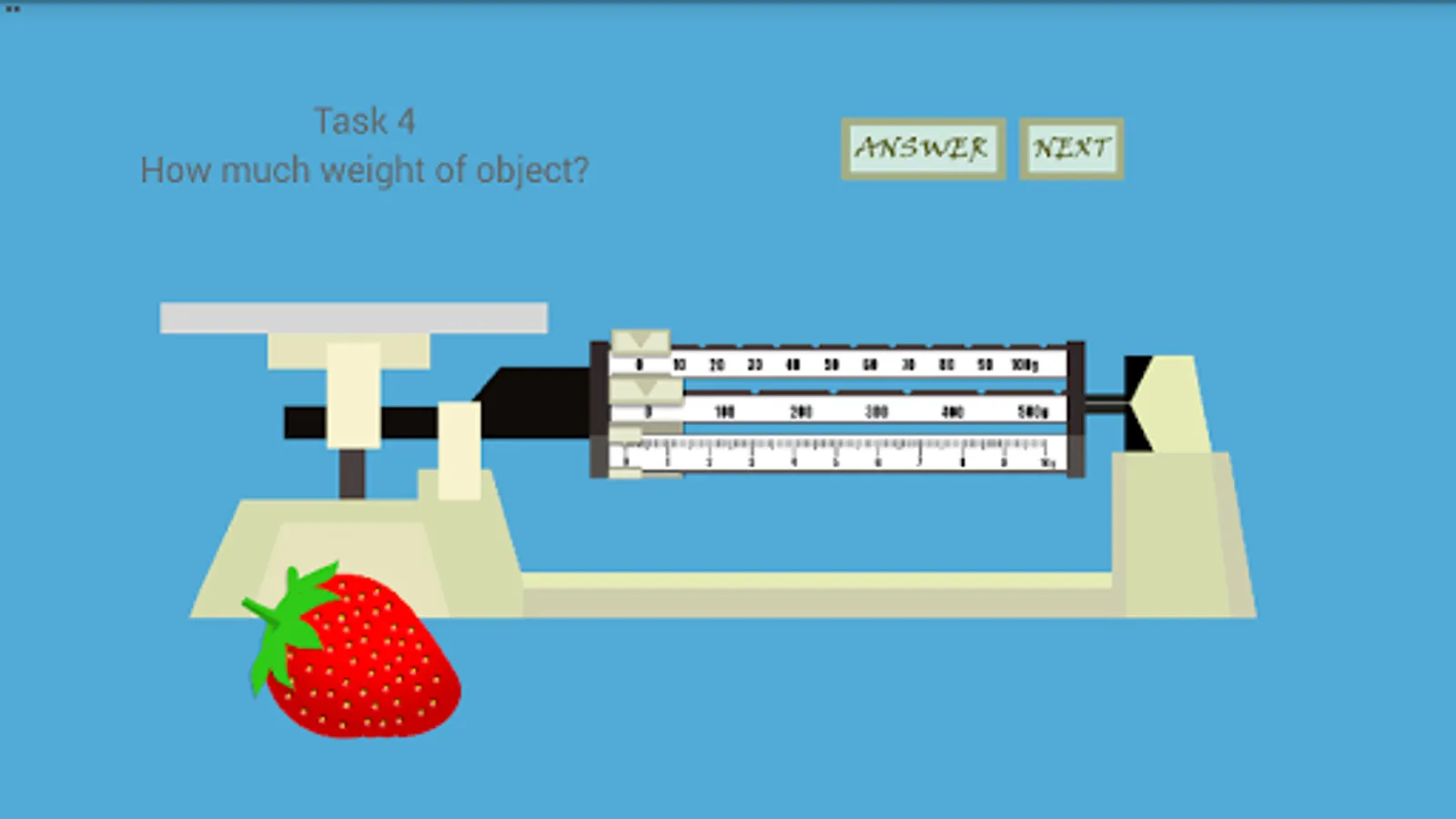 Triple Beam Balance is an simple game that simulate how to measure an object with Triple Beam Balance device. This game have 20 task that must finished by player to learn how to do measurement. In every task player will be given by one random object with random weight. With this app, players are expected to master the basics of using a triple beam balance. Try it and have fun!