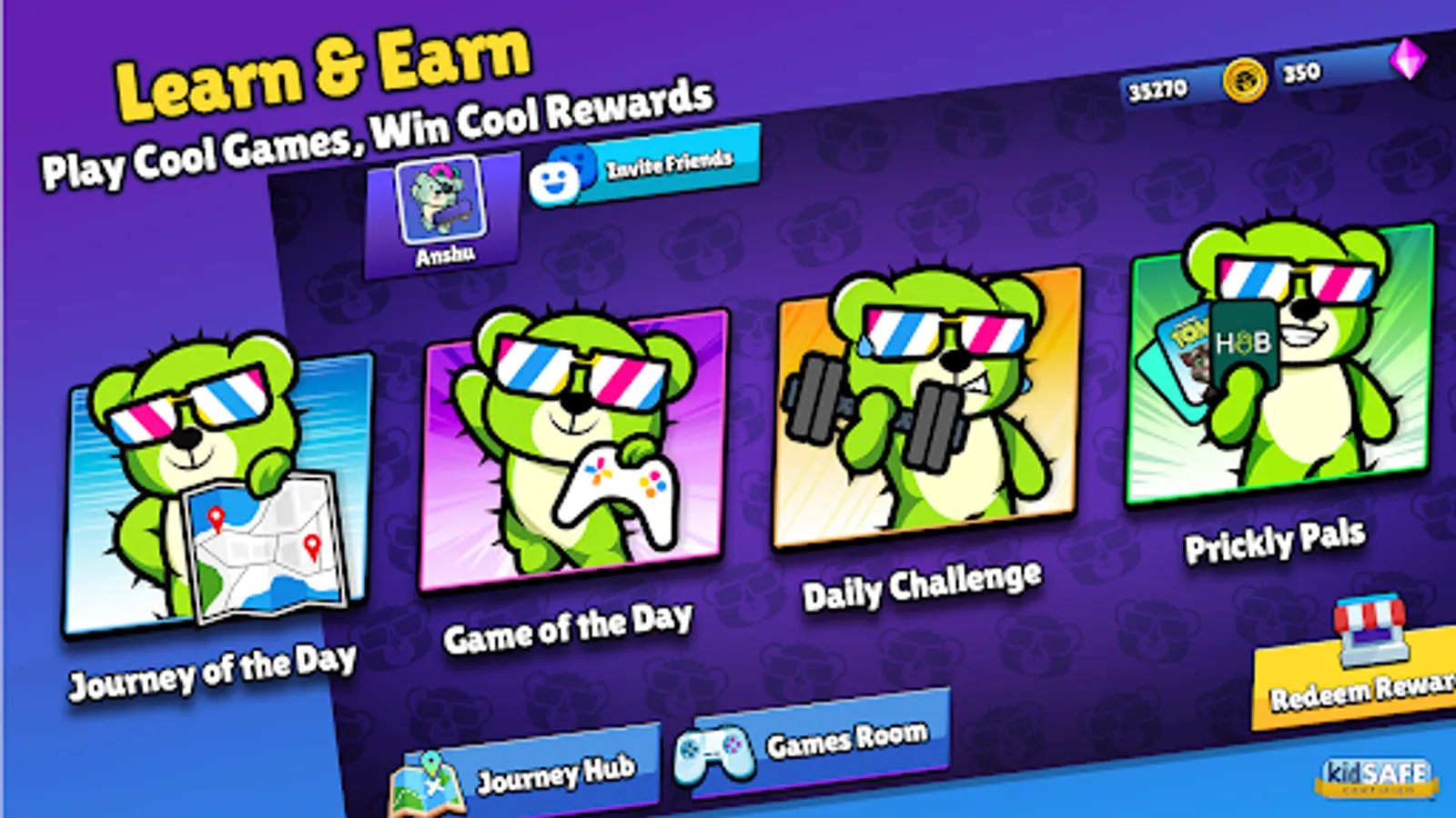 2. Earning by learning. The more time they spend learning and the more courses they complete, the more Bearbux kids will earn. Bearbux is a form of virtual cash that can only be redeemed in certain games that kids love, and which are 100% Prickly-Bear-certified.