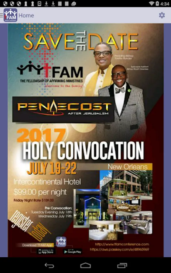 Welcome to the official mobile app for the TFAM The Fellowship Of Affirming Ministries! This app is a joint development of Pride Labs LLC and The Fellowship Of Affirming Ministries; it's designed to be a comprehensive guide to our conference each year, including workshops, speakers, events and interactive features.