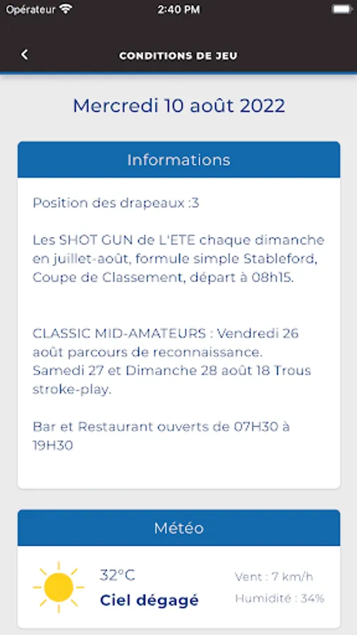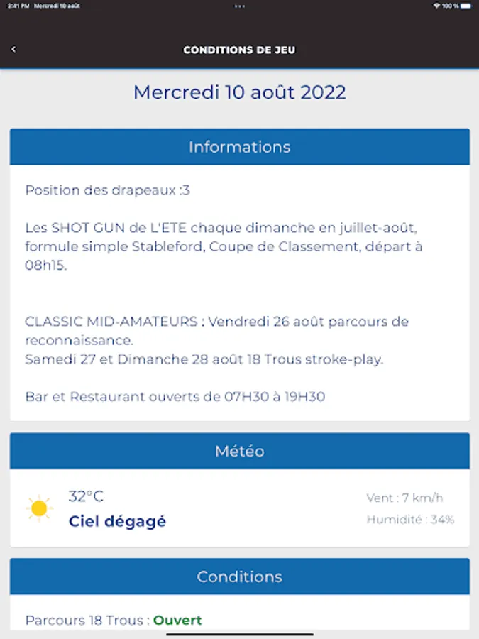 Download the App. of your Golf which allows you to access a panel of services with ease and join thousands of golfers who, like you, are looking for an application to book a tee, register for a competition, consult the tee times and the results of competition, subscribe or re-subscribe, reload your practice card ... Access all the services of your golf course in a few clicks and take full advantage of your visit without any constraints!