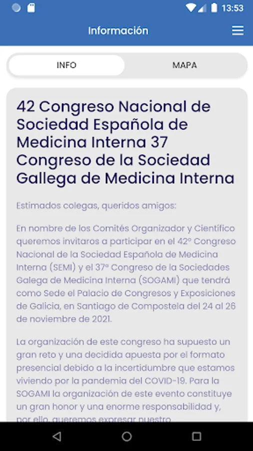 Official App of the 42nd National Congress of the Spanish Society of Internal Medicine (SEMI) and the 37th Congress of the Galician Societies of Internal Medicine (SOGAMI) which will have as its headquarters the Palace of Congresses and Exhibitions of Galicia, in Santiago de Compostela from 24 to November 26, 2021.