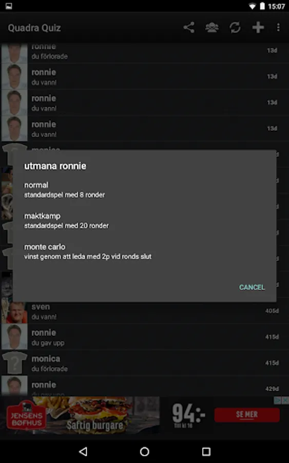 QuadraQuiz is a classic trivia question duel. You and your opponent get the same questions and compete in getting the most of them right! When both players have answered the question, one of you get to pick the next category. - Pick one that will suit you better than your opponent. Or a category you'd like to know more about.