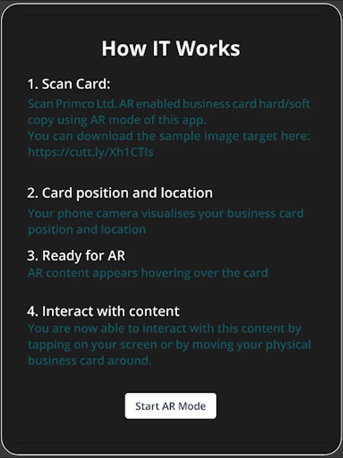 An AR business card app is a mobile app that the user can use to scan the business card. This approach does not require a QR code.