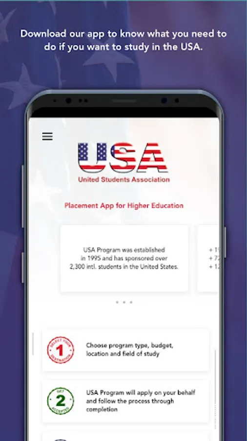 We can help and guide you to study in the USA. You can download our app and follow the 3 steps. It's easy and fast! If you want to have the best experience studying in one of the greatest universities in the United States, come with us. Are you ready?