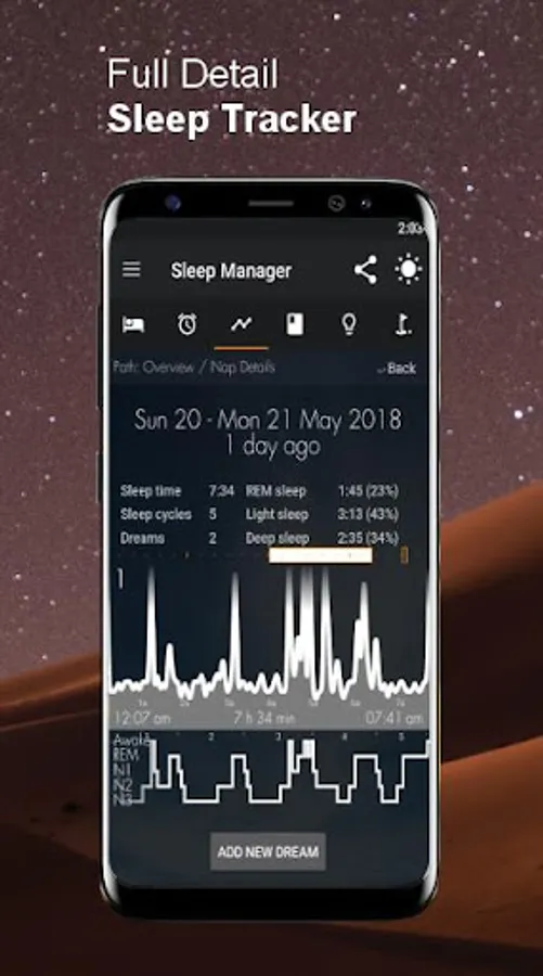 The bottom section uses the movement information to calculate a rough estimate of your sleep cycles (numbered on top) and even individual sleep phases during each sleep cycle (Awake, Dreaming (REM), Light Sleep (Non-REM 1,N2), Deep Sleep (N3). The app uses the actual measurement (e.g. long stretches of low movement are likely to be deep sleep), averages (mainly in case of REM) and basic knowledge about sleep cycles (duration approx. 90 minutes) to create a reasonable best-fit hypnogram graph. This is why it will still show sleep cycles if the phone is placed on a desk. The app assumes that the user is actually sleeping.
