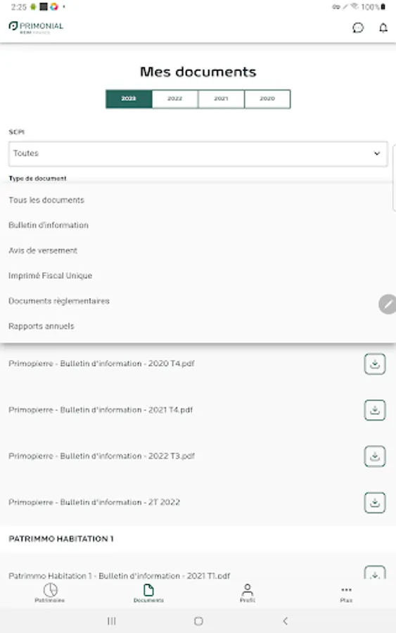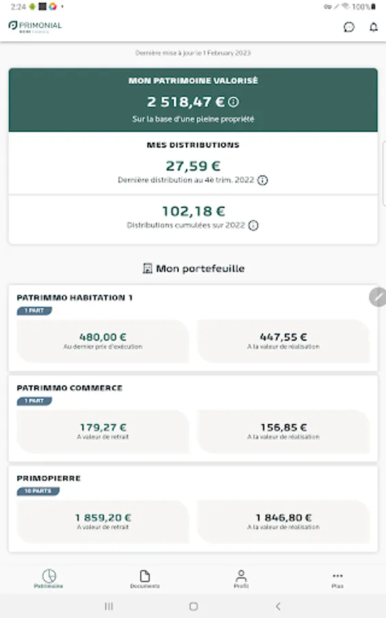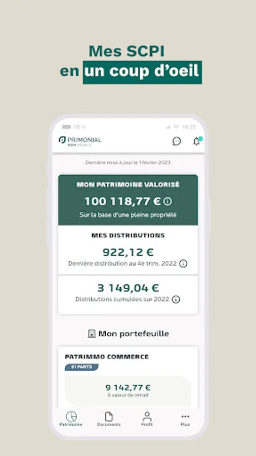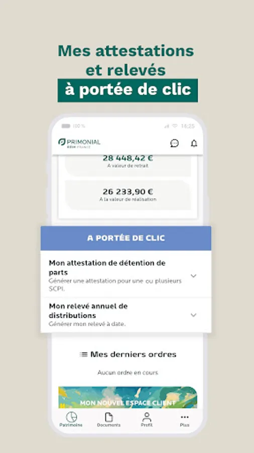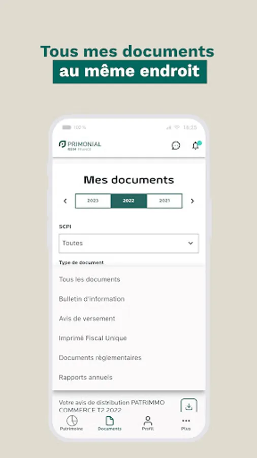 It allows you to visualize at a glance the summary of your real estate savings at Primonial REIM France. You will find your financial situation, the details of the products held, your share certificate, your distribution statements and your tax documents.