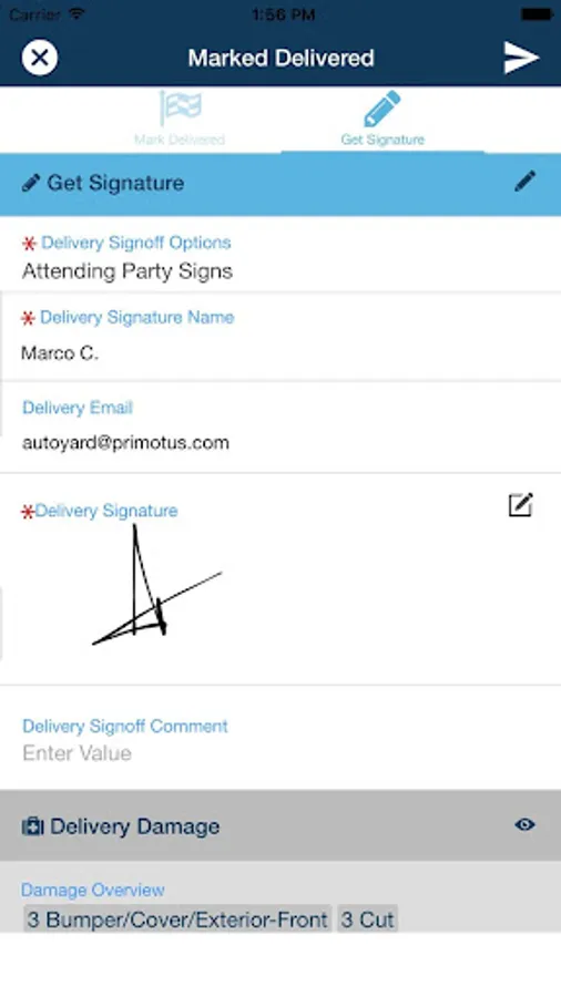 Bill of Lading is emailed to receiving party along with driver and receiving-party signatures, damage, and any pictures.