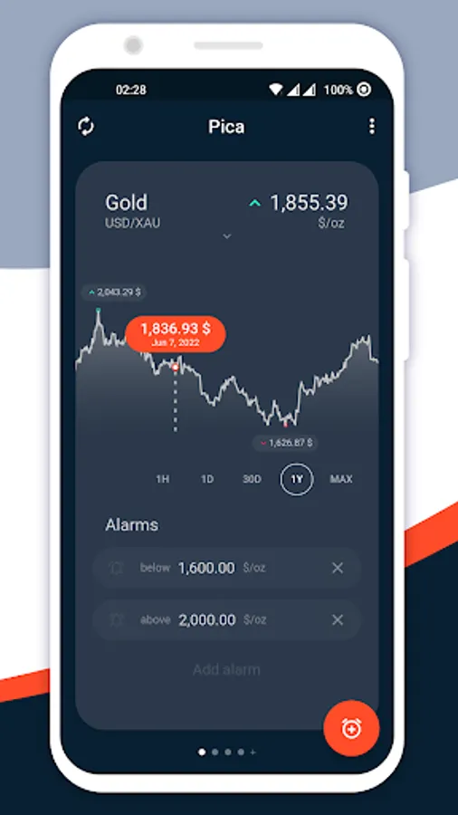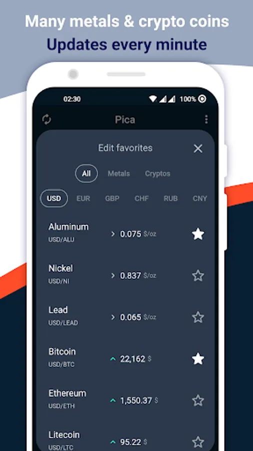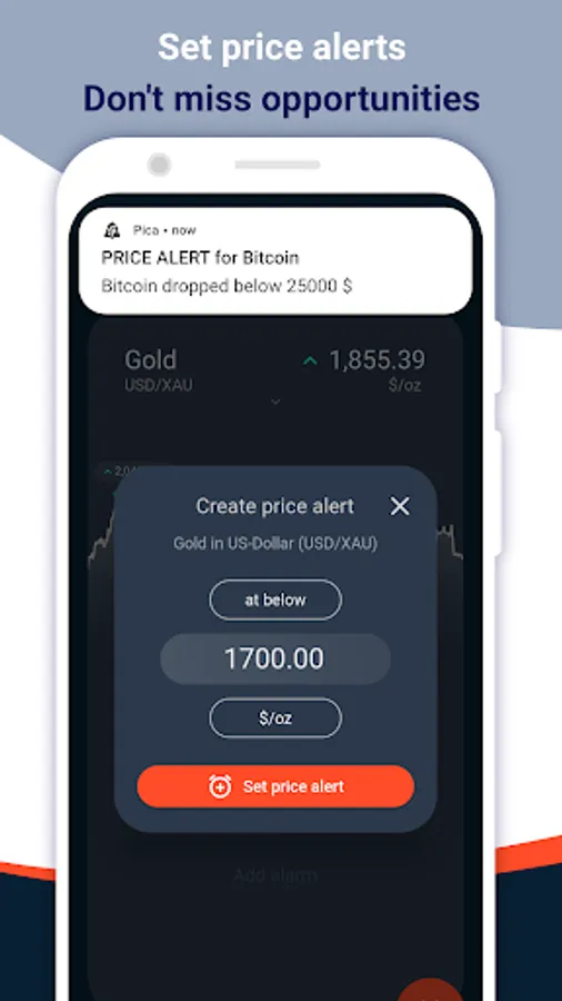 Make wise investment decisions by getting live metal & crypto price alerts on your phone 24/7 with Pica. View precious metal prices such as gold price live, palladium price, silver price, or view base metal prices such as lead, iron, and copper prices. Crypto currencies are now available, you can set price alarms for bitcoin, ethereum, litecoin and many more.