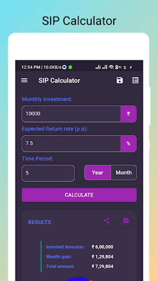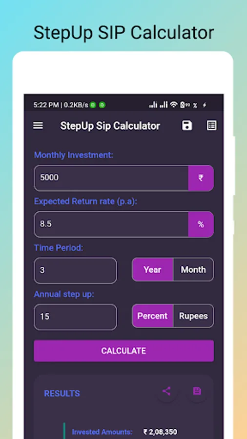 SIP in Mutual Funds is one of the ways to save money and invest. This easy SIP calculator helps you plan your SIP investments. With SIP calculator app you can see estimated gain across different mutual fund categories. You can see both SIP returns as well as one-time (lumpsum) returns and step up investment.