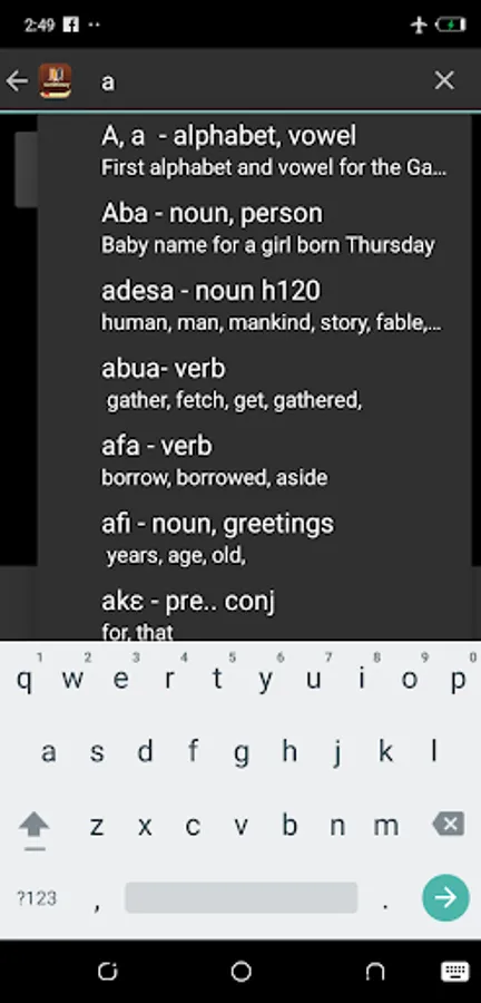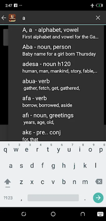 The app offers you a wide range of over 10000 Hebrew words and 7000 Greek words which were translated to form the bases of the Ga Bible and other literal work done by the pioneers of the Ga language.