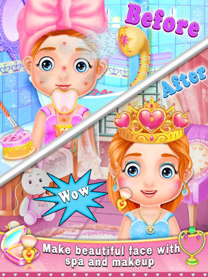 Wash the princess's face and trim her eyebrows. Apply blush and red lipstick necklace, ear ring, hair, different types eyebrow and apply many color eyeball for a fashionable princess look!