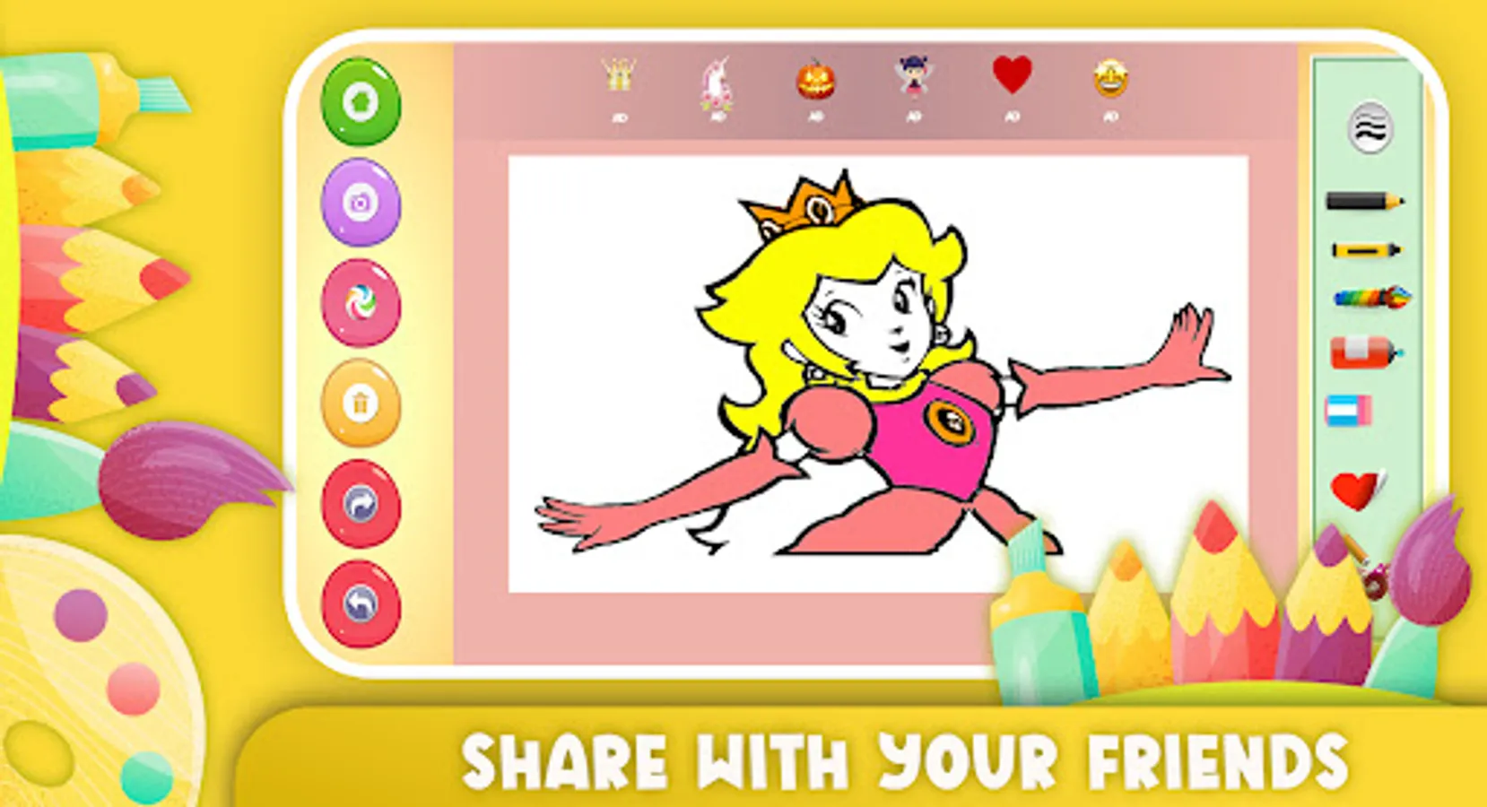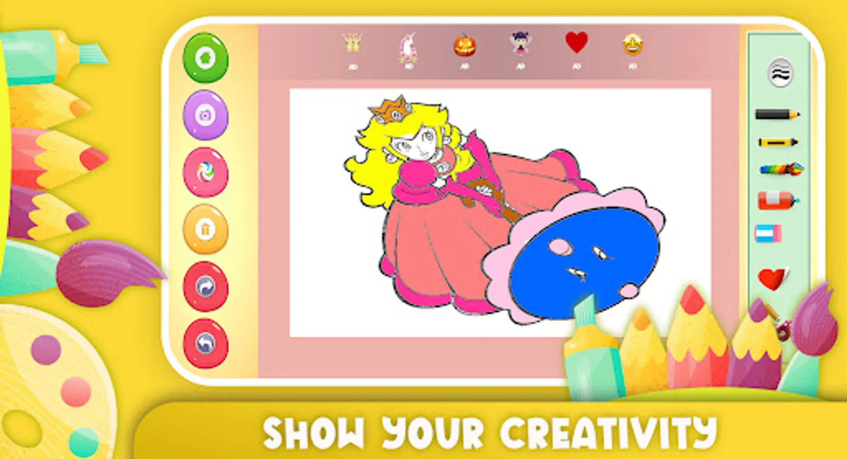 Coloring Princess peach application is such a fun app to boost your mood and refresh your mind by coloring the pictures of Princess peach.