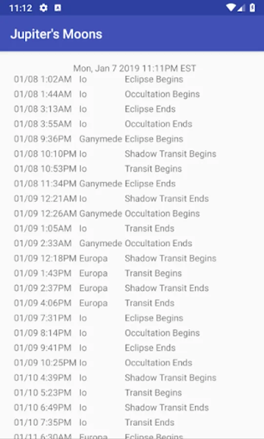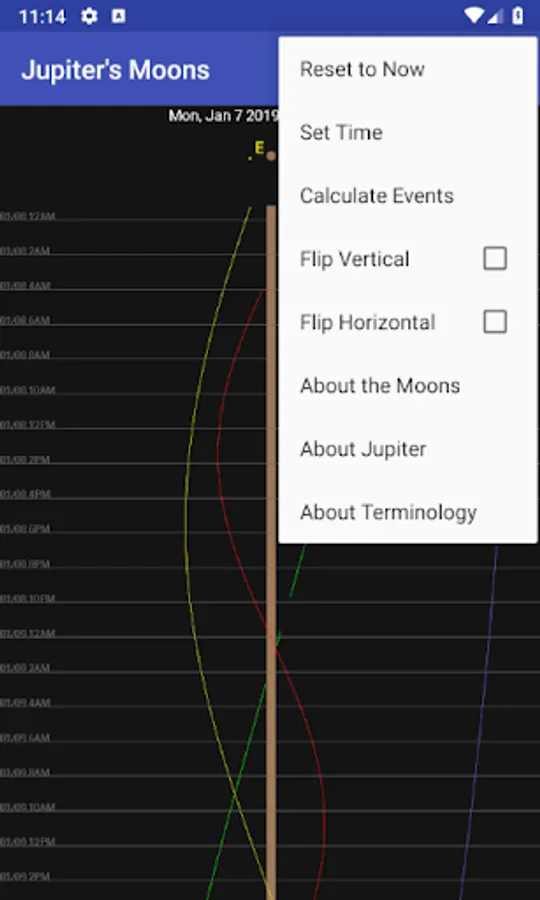 A diagram showing the relative positions of the Galilean Moons of Jupiter so that they can be identified in a telescope or binoculars. Shows dates and times of events such as eclipses, occultations, transits and shadow transits. Has a scrollable graph so you can see what they will look like at any given time. The view can be inverted and/or reversed to match the view through a telescope.