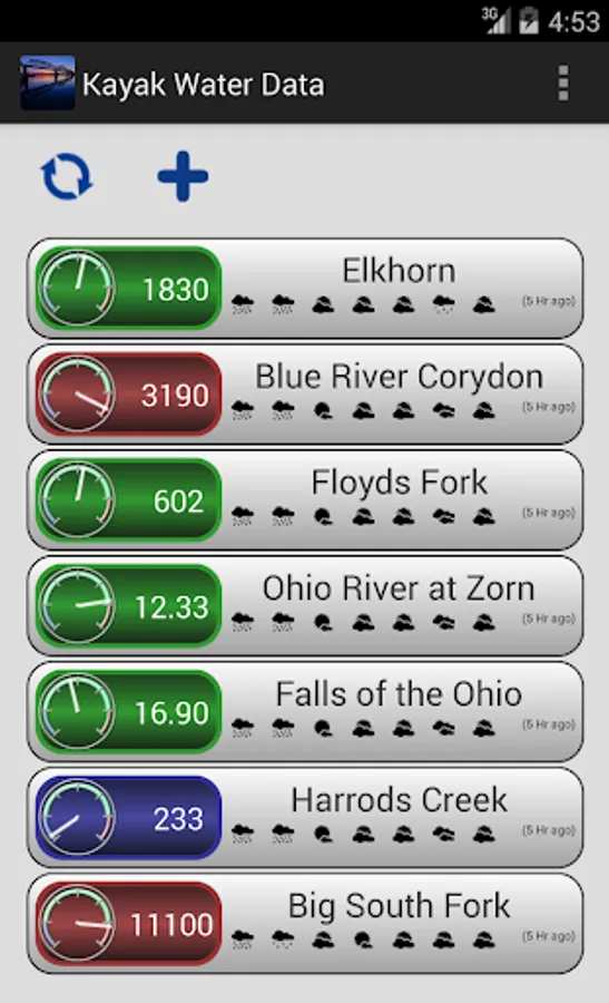 This widget is designed for kayakers to determine local (and surrounding) water levels of popular rivers. It can be added to the home screen as a 1x1 or 1x2 widget, in the 1x1 mode it will just show the top 6 entries, which are the most local to Louisville.