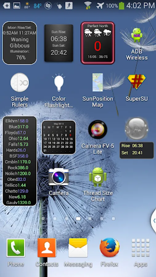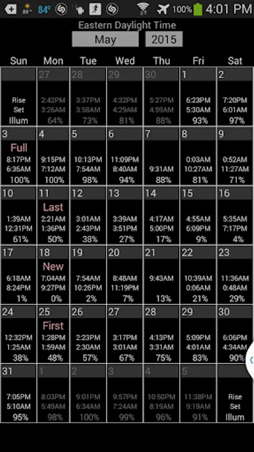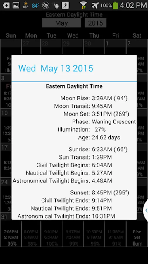 This app includes a widget that displays the current phase, illumination, and rise and set times of the moon for the current location. It also includes a calendar to show the rise, set, illumination, and phases for each day of the month. Clicking on a day brings up detailed information about the moon rise and set positions, as well as information about sun rise and set, and twilight information.